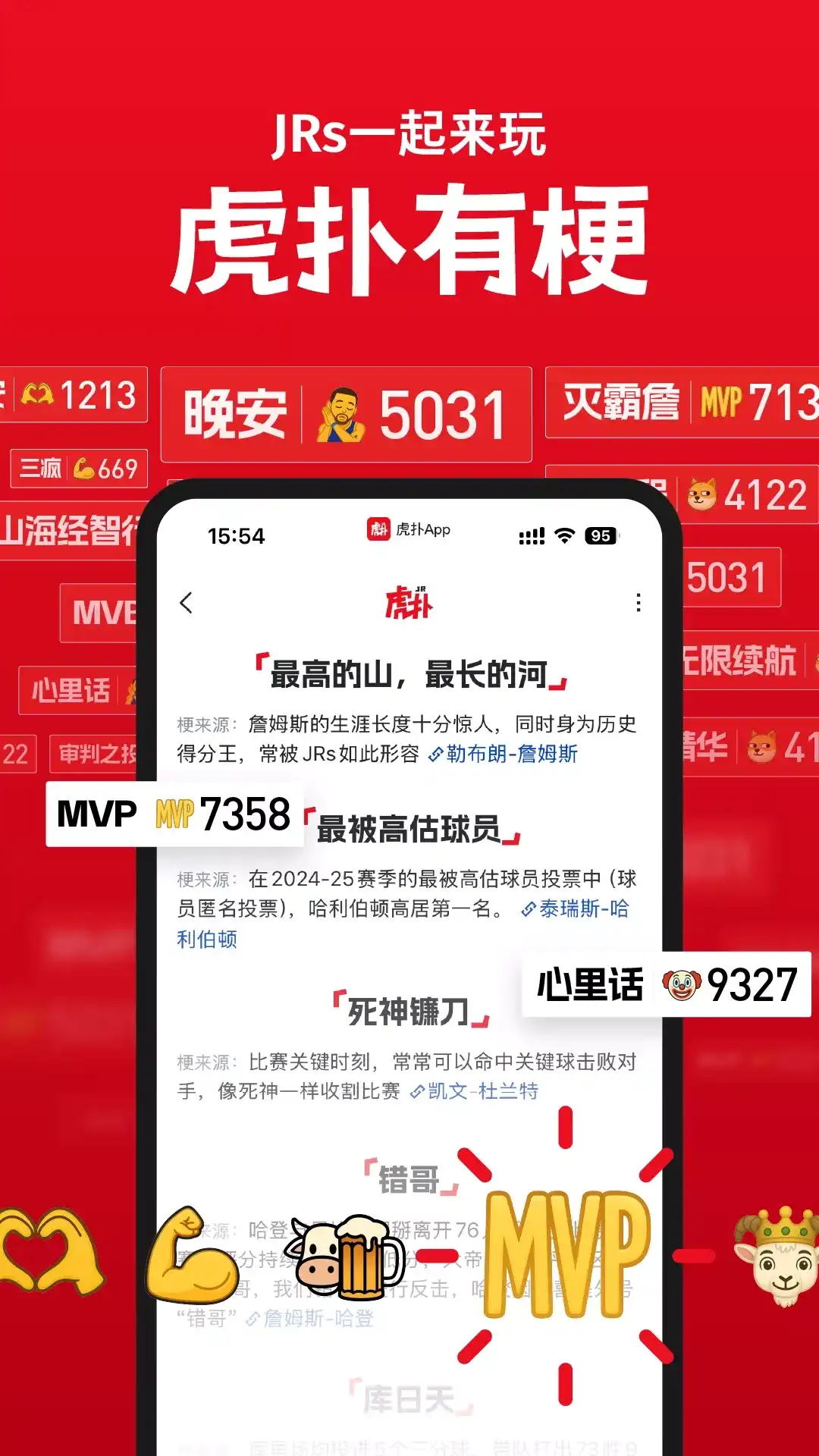 虎扑,真实有趣有温度,男人感兴趣的话题都在这里! 内容真实精彩,神评拍案叫绝。JRs个个都是人才,说话又好听,注意控制时间,不要上瘾哦! 这里是亿万体育迷游戏迷影视迷的精神家园,在这里可以看实时数据,分享专业观点,打出客观评分。 这里是大学男生宿舍,你可以丢掉包袱做真实的自己。 这里是女生观察实验室,以不同视角“监视”你的男友,也许还能“网络相亲”找到一段良缘。 这里是年轻人的疗伤回血圣地,上班上学一天累了,刷刷虎扑看看神评金句,笑到发抖;感情生活工作遇到了挫折,有温暖又幽默的JRs给你排忧解难。 获得关于篮球、足球、游戏电竞的海量内容,与专业又不失有趣的 JRs 讨论、分享和学习实战经验,给心仪的球员来打分,交流正品低价运动装备等。还能近距离与库里、阿德托昆博、林书豪、武磊等球星进行互动。 -[与偶像近距离互动] 在虎扑,经常有各领域(娱乐圈、NBA、CBA、游戏主播等等)的艺人&大神会前来与大家分享生活点滴。章若楠、宋欣冉、吴克群、徐冬冬、李佳航、成果、黄渤、张天爱、景甜、陈钰琪、李一桐、庆余年剧组、库里、林书豪、郭艾伦,数百明星艺人都在虎扑接受JRs的拷问!在虎扑表达不一样的那一面。想要知道他们的日常生活,和自己的偶像亲密接触,提出台前幕后的花絮问题?「终于轮到我了」满足你的愿望! -[个性化兴趣亮回复社区,共享人生经验,让你成长] 在「体育版块」,获取真实客观的资讯,和你的主队一起战斗; 在「步行街」观世间百态,听肺腑之言,体验精彩的人生,极容易上瘾,请控制时间; 在「影视区」聊电影,写影评,为影视作品表态,不为资本折腰,用值说话,避免陷坑; 在「数码区」通过大神攻略去得到真正适合你的数码神器; 在「车友交流」和大神交流,买车前先问问老司机; 最精彩的还是「亮回复」,打开虎扑亮评区,还你一个段子世界,大神网友机智神评论,抖机灵、恶搞梗、神补刀、人生经验,好玩有用回复刷到停不下来! - [感受电竞氛围,学操作攻略] 虎扑是一个热闹的电竞社区。在这里你可以获取大量的一手游戏资讯,与百万游戏迷共享自己的竞技态度和游戏人生!在这里,你可以与众多玩家们讨论游戏心得、分享比赛见解,更有职业战队、顶级主播、天梯大神常驻做客,与大家真诚交流,手把手教你玩转游戏。