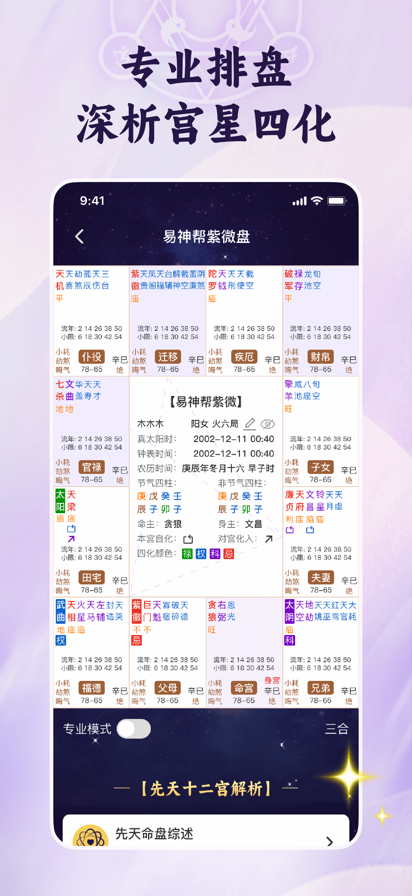 超好用的免费专业紫微斗数排盘,紫微斗数为中国传统术数预测学最高端的预测学,通过出生时间所呈现的紫微星相来算命。 万宗紫微斗数排盘软件,提供免费的紫微斗数排盘功能,包含三合、四化、飞星、八字等专业的命盘内容,同时万宗紫微斗数,还提供自助解盘及紫微斗数排盘免费详批等功能,欢迎大家使用。 【命盘分析】三合、四化、飞星、八字等四大常用命盘展示。 【个性定制】提供各种个性化定制功能,允许用户自定义命盘星曜展示 【命书解读】提供上万字的命盘解读内容,协助用户进行命盘分析 【档案管理】允许用户创建超过千个不同的档案,方便进行档案分类,以及批量新增档案等功能。 【国学工具】提供万年历,黄历,罗盘等等不同的常用国学工具免费试用