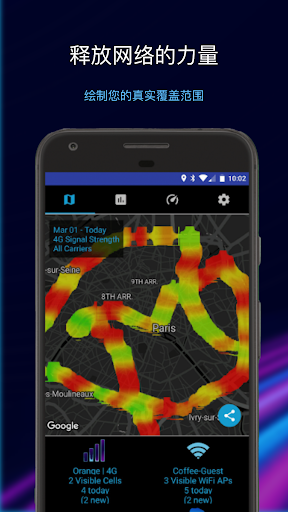 Coverage 可以根据您手机的信号强度读数,绘制属于您自己的蜂窝网络和 WiFi 信号强度地图。<br><br>看看设备在哪里可以获得更好的信号强度,又在哪里会遇到盲区。绘制您自己的信号强度地图,进行速度测试,检验运营商的宣传是否属实。<br><br>测试网络性能<br>- 绘制蜂窝网络和 WiFi 信号强度地图<br>- 兼容 GSM、CDMA、UMTS 和 LTE 蜂窝网络<br>- 使用手机中准确的 WiFi 和蜂窝网络信号强度读数<br>- 找出常用路线中的盲区<br>- 测试连接速度<br>- 更换 SIM 卡,比较不同运营商的信号强度<br><br>大量关于手机 WiFi 和蜂窝网络的有趣统计数据<br>- 平均 LTE 信号强度<br>- 今天发现的新基站数量<br>- 手机连接 WiFi 的时间有多少<br>- 手机连接 LTE 网络的时间有多少<br>- 平均 WiFi 信号强度<br>- 更多有趣数据