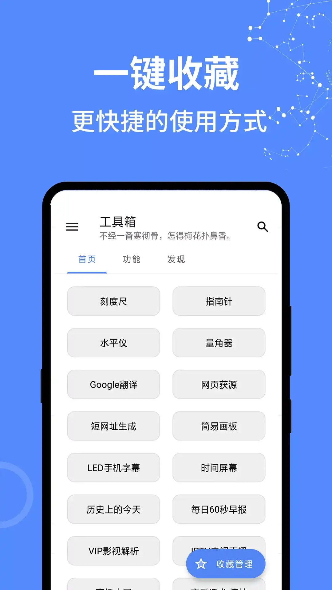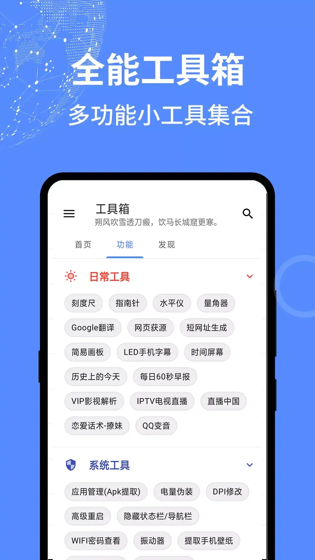 一款多功能实用工具箱。 实用工具箱提供了从日常、图片、查询、设备、提取、趣味等多方面的功能,操作简单,即点即用,避免您下载超多应用的难题,且应用体积轻巧,界面简洁。 部分功能介绍:应用管理(提取安装包,应用信息查看),屏幕滑动器(定时自动滑动手机屏幕),坐标连点器(自动连点,解放双手),图片转素描(图片一键转换成素描风格),金属探测器(探测附近金属和磁场),悬浮播放器(聊天刷剧两不误),动态视频桌面(设置桌面动态视频壁纸),LED滚动字幕(手持弹幕),画板(DIY随手涂鸦),桌面图片(便捷桌面小部件图片显示),图片拼接(多图横纵向拼接),夜间护眼模式(避免受到强光刺激影响视力),随机数生成(自定义生成随机数),手绘图片(一笔一画的动态绘制图片),空文件清理(清理无效空文件),亲戚称呼计算(轻松搞定亲戚关系),时间屏幕(全屏显示当前时间),二维码生成(任意文字或链接生成二维码),视频提取音频(提取视频背景音乐) 有趣好玩的黑科技功能如:透明屏幕、代码雨壁纸、图片隐写术、隐藏图制作、悬浮播放器、动态视频桌面、屏幕滑动器、坐标连点器、特效相机、屏幕准心等 还有很多日常小工具,如尺子、画板、水平仪、量角器、测距仪、振动器、纯音测试、金属探测器等,更多炫酷功能尽在其中。