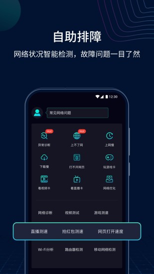 一款5G网络测速、网络情况跟踪和专业网络测试为一体的专业型测速软件。新增5G测速功能,方便满足5G用户测网速,为迎接5G时代做好准备。 各种场景下的网络测速为一体的软件,测网速专业版,WiFi检测,宽带测速,游戏测速,电信测速、移动测速、WiFi管家,WiFi测速,手机网络测速;5G网速测速都能帮你实时监测到网络类型,一键测试当前网速的上传,下载,告别卡顿。 【蹭网检测】 网速慢?一键检测蹭网设备 【查看历史】 方便查看测速历史,对比每次测速结果 【WiFi信号测试】 信号差?一键测试当前WiFi信号强度 【游戏测速】 玩游戏速度太慢,怎么办?一键查看当前网络的网速延迟 【流量监控】 设置你的套餐流量,实时查看当月的详细流量使用 【Ping测试】 游戏卡顿?专业Ping测试了解网络稳定性 【网络诊断】 突然断网、连网却无法访问网页,一键诊断各种网络问题