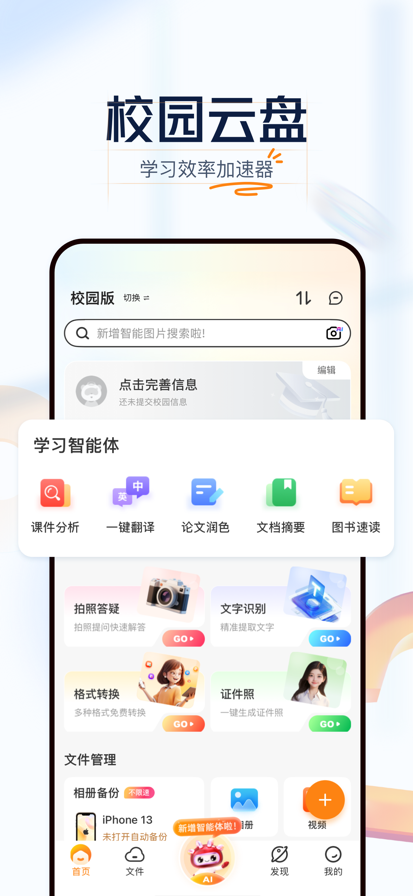 联通云盘是中国联通为满足用户海量数据的存储需求,面向个人及家庭用户提供的个人云家庭云、微信/通讯录/相册自动备份、多端文件共享、AI工具箱、影视剧资源等云服务,旨在为用户带来更安全、更智能的全场景融合云存储及数字化体验。 【新上线功能】 1、【相册备份】相册一键备份,iOS系统live图保存,可以AI智能分类搜索,提供时间线浏览等功能,轻松管理海量影像记忆。 2、【AI轻写真】轻松解锁多种风格,一键存储到云盘,随时随地获取定制个人写真照。 3、【即时通讯】消息中心增加即时通讯功能,涵盖点对点即时聊天、会话内文件分享及便捷好友添加功能,打造云存储与通讯新体验。 4、【老照片修复】一键修复,多种效果,老照片焕新颜,重温往昔美好瞬间,每一张照片都是一个故事。 5、【AI助手】精心设置“生活顾问、内容创作、职场助手、学习指导、文档帮手”五个维度的AI内容生成,更有AI聊天满足您的知识问答和情感沟通需求。 【产品优势】 1、【定向免流】联通云盘尊享、白银、黄金、钻石四档会员用户,每月免费领取30GB定向流量(限话费订购用户)。 2、【不限速度】提供中国联通独有高带宽能力保障,用户上传/下载不限速,畅享极速云存储体验 3、【安全服务】通过国家公安部信息系统安全三级等保认证,采用多重加密技术,确保数据安全,提供备份恢复、权限管理等全方位防护。 4、【影视资源】集成海量高清影视库,热门院线海内外电影、剧集、戏曲、养生等一应俱全。 5、【私密空间】为敏感数据文件提供独立加密存储区域,严格管控访问权限,保护个人隐私与重要资料。 用户协议 (EULA): https://www.apple.com/legal/internet-services/itunes/dev/stdeula/