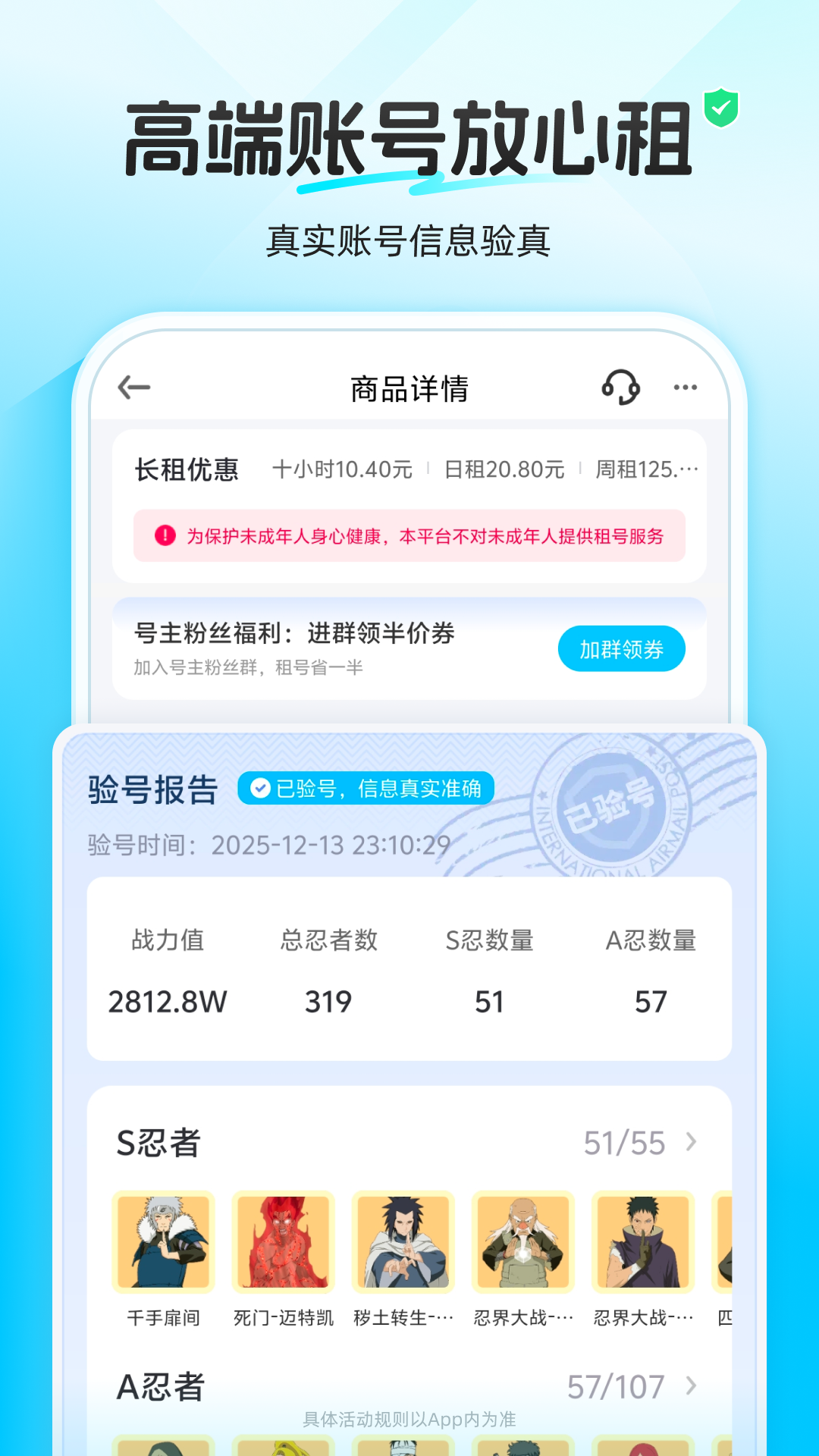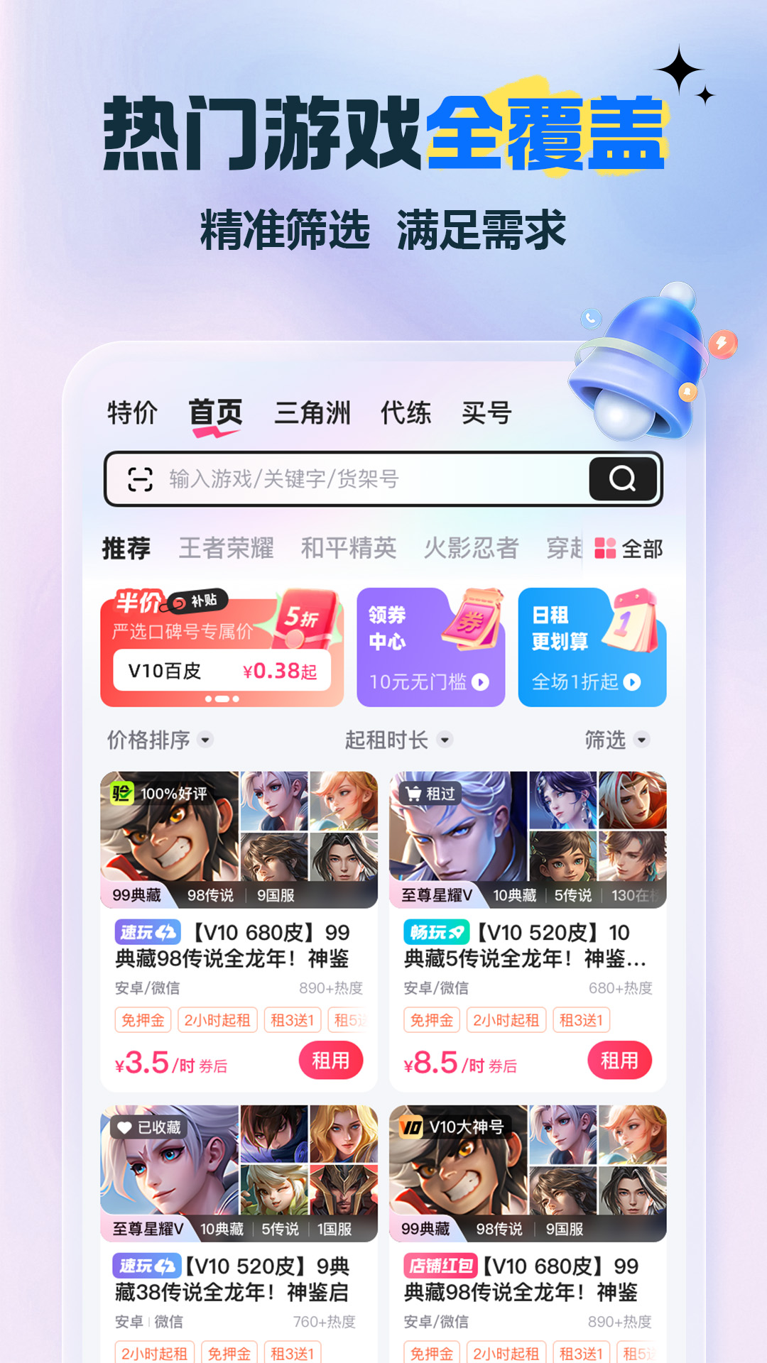 王者号、和平号、火影号出租<br>新人免费体验,注册即可领取红包。<br>租号玩专业版,专业的游戏体验平台,更简单更专业!涵盖竞技、MOBA、RPG等全品类热门手游的游戏体验服务。<br>【防沉迷保护】实名认证并添加人脸活体流程<br>【专享福利】官方红包助力游戏体验,租送惊喜活动邀你开启<br>【超值服务】百万优质账号,低至1元体验<br>【安全上号】一键自动登录,加密安全有保障<br>【高效协作】超值账号置顶,快速获取心仪账号<br>【化繁为简】超小安装包,超便捷体验流程