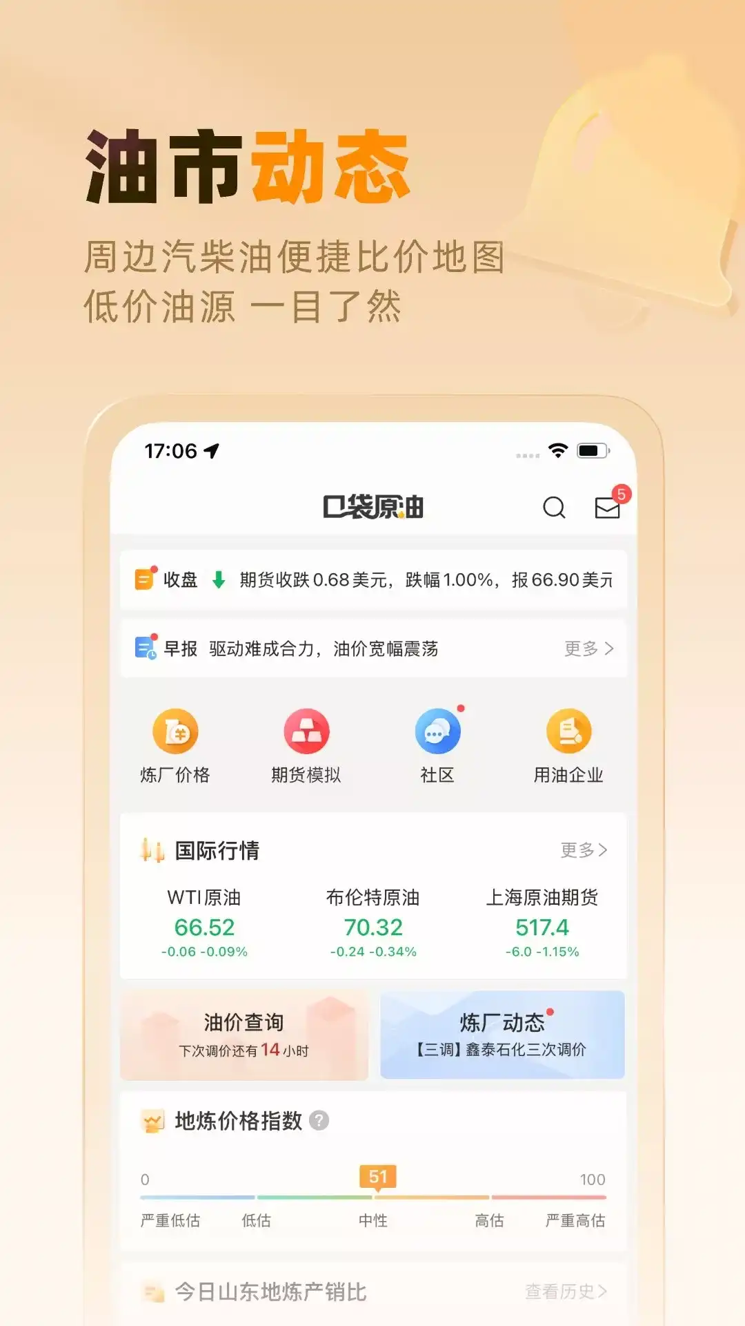 口袋原油是专注于能源石化行业的资讯信息平台,为您提供国际原油、美原油、布伦特原油、账户原油、国际现货、全球指数、大宗商品、上海能源、贵金属指数等国内外原油市场行情报价,以及成品油相关炼厂报价与全国各省汽油、柴油批发零售限价,同时还为您提供石油相关实时资讯、库存信息。我们始终以用户体验为首位,致力于打造能化行业新生态,帮助石化企业、贸易商、加油站等行业用户把握市场机会,降低交易成本,做好经营决策。 特色功能 【行情自选】:支持国内外全市场品种,原油行情,一应俱全 【资讯新闻】:7x24小时实时新闻资讯,市场动态,尽在掌握 【原油库存】:同步美国EIA原油库存信息,原油走势,快人一步 【炼厂报价】:同步主营、地方炼厂报价,价格变动,随时可查 【批零限价】:同步汽油、柴油批发零售限价,政策风向,了如指掌 口袋原油是一款专为国内成品油(汽油、柴油等)产业链用户打造的应用。我们的用户群体包括期货投资者、主营炼厂、地方炼厂、成品油贸易商、加油站、工矿主、建设工地主、物流园区货车主等等,涵盖油品上下游各个环节的讯息,我们提供以下服务: 【行情报价】:提供WTI原油、布伦特原油、上海原油期货等大宗商品期货实时报价和走势,帮助用户及时了解国内外油品市场动态和价格变化 【主营、地炼每日价格】:每日及时更新山东地方炼厂、全国各地主营炼厂出厂价(中石化、中石油、中海油、中化)、每日炼厂调价信息、山东地炼每日产销比、汽柴油各地区每日零售批发限价,让用户更快速、更及时地了解原材料每日价格走势与供需情况 【大宗资讯和市场分析】:提供关于原油、石油及其下游化工相关大宗商品的新资讯和市场分析,帮助用户做出明智的投资决策 【资讯新闻】:7x24小时实时新闻资讯,市场动态,尽在掌握 口袋原油是您了解原油体系和大宗商品市场的绝佳工具,无论您是汽柴油产业链的从业者还是期货交易者,我们都能为您提供准确、实时的数据和资讯,助您把握市场机会,做出明智的决策。