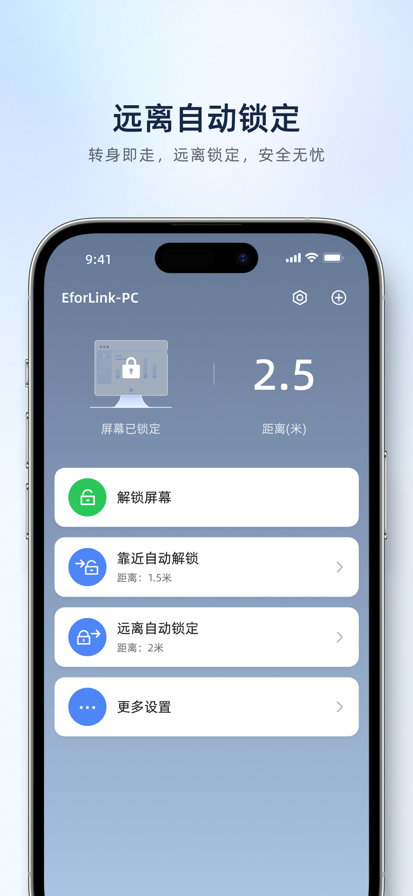 将“近启锁屏卫士”硬件插入电脑,并在手机APP中进行简单设置,即可实现手机靠近电脑自动解锁电脑、远离电脑自动锁屏的功能,且支持远程锁屏和解锁电脑,大幅提升办公及日常使用效率。 【智能无感解锁/锁屏,安全省心,隐私无忧】 -自动感应,无需手动操作:设置好解锁和锁定距离后,当您携带手机靠近电脑,屏幕即自动解锁;离开时,电脑自动上锁,全程无感操作,高效便捷。 -灵活调节感应距离:可根据实际使用场景,自定义设置靠近解锁与远离锁定的感应范围,满足不同环境需求。 -远程控制:电脑联网即可远程锁屏和解锁,打破空间限制,告别忘记锁屏的焦虑; -一手掌控多电脑设备:一台手机即可无感控制多台电脑设备; -广泛适用多种场景:特别适合办公、居家等场景,保护隐私的同时减少反复输入密码的麻烦,让您使用电脑更轻松、更专注。