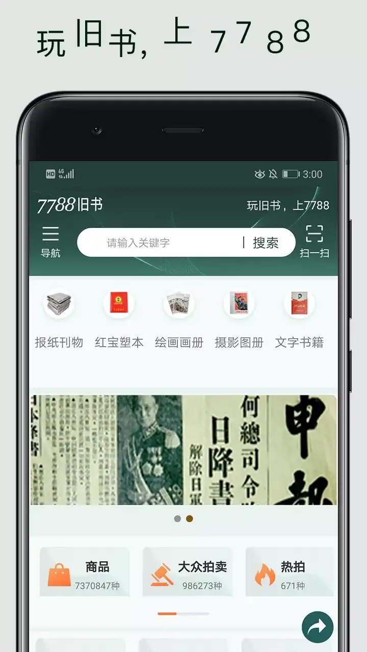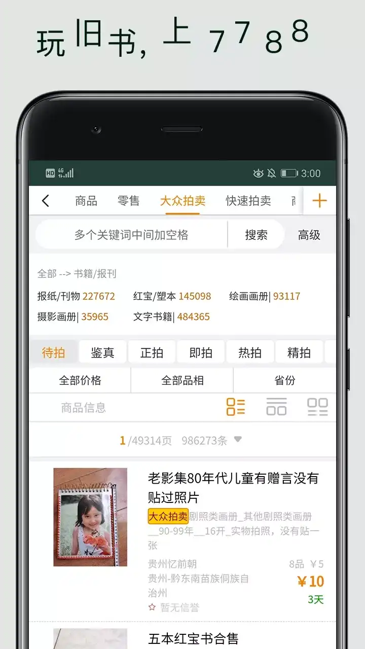 7788旧书是专业的旧书收藏、鉴定、投资、加价交易平台,主要提供专业的旧书分类目录、权威专家鉴定、交流会和拍卖会信息、论坛交流以及多种交易模式等版块功能。 【经营品类】:古籍善本,民国旧书,期刊,报纸,红宝书,日记本,纪念册,画册,写真集,历书,药书,文献,课本/教材,歌谱,剧本,诗选,小说,散文集,传记等。 【交易模式】:零售、批发、大众加价、快速加价、自由交易、约定订单等多种交易模式。 【网站特色】 1、商品种类丰富,八千万件商品供您选择。 2、近十万入驻活跃商家,百万买家在线交易的业内权威平台。 3、支持商品鉴定,权威专家团队把关,提供行业权威鉴定。 4、网站成立于1999年,在行业深耕二十余年,获得广大藏友的认可和信赖。 【APP功能】 1、商品上架实现快速连拍、多图同传的便捷功能; 2、在线交易信息的实时提示系统; 3、手机支付宝、手机微信支付功能; 4、分享到微信、朋友圈、QQ好友、QQ空间功能; 5、信息通知推送功能; 6、商品发布、商品买卖、订单商谈、商品搜索、好友交流等等主要功能。