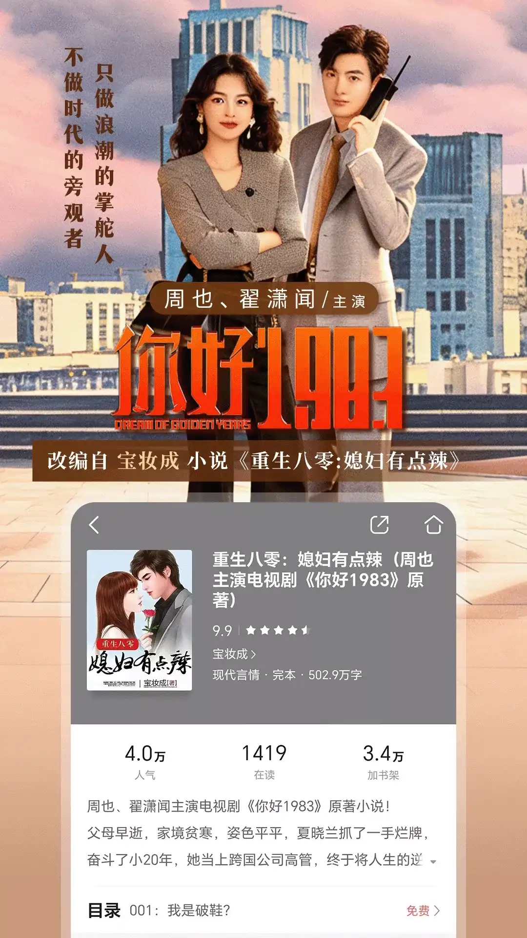 唐宫奇案之青雾风鸣、成何体统、镖人、寻秦记、唐朝诡事录、许我耀眼、四喜、围猎、入青云、与晋长安、锦月如歌、生万物、凡人修仙传、国色芳华、淬火年代长安的荔枝、折腰等经典原著。 万古刀、独步成仙、草民、便携式桃源、不朽神魔诀、万仙来朝、万剑朝宗、燃烧的蜂鸟.时空追凶1990、血孩子、保护我方族长、龙魂剑圣、何日请长缨、牧神记、深空彼岸等热门网文出版图书。 【热播影视】 《逐玉》:张凌赫、田曦薇主演同名电视剧原著!市井屠户女命遇落难侯爷,先婚后爱、乱世甜虐,烽火炼真情! 《重生八零:媳妇有点辣》:周也、翟潇闻主演电视剧《你好1983》原著,天崩开局奈我何?看她重生80满级开挂,狂揽商机逆袭致富! 《太平年》:白宇、周雨彤主演电视剧《太平年》原著,纳土归宋巧施太平计,保境安民苦守苍生愿,揭秘如何以“放下”成全万世太平? 《亏成首富从游戏开始 》:彭昱畅、林允主演电视剧《年少有为》原著,老板巧施亏钱计,神仙队友误上暴富班,揭秘如何“亏”成首富? 【霸榜好书】 《大雪满龙刀》:名家乱世狂刀再开玄幻新章!红月吞天,妖魔横行。且看少年孤身出北境,龙刀所向,斩出一条染血通天路! 《我有一个修仙世界》:仙门卷王高中生,卷完高考卷修仙!两界穿行,从筑基梦到三界巅峰!修仙考试,他都要赢! 《除恶》:任素汐、王骁主演热播剧原著小说!绝望父亲为救尿毒症女儿铤而走险贩毒,女警闺蜜卷入缉凶与情义两难。 《我在妖武乱世,武道成神》:穿越妖魔乱世,他手握【饕餮熔炉】献祭武学,从凡俗拳法杀至真神之境!武学无上限,实力破天道! 《年代:我靠每日情报截胡旺夫媳妇》:穿越六零,他靠每日情报截胡媳妇、寻宝屯粮,带全家领先时代奔小康! 【精彩短剧】 《从此星河不相逢》《门内有人》《神女白禾》《桃花烬》《觉醒当日,我重订人生指南》《净身出户后,我转身踏青云》《长歌有和,独行有灯》《夫人她专治不服》 【产品功能亮点】 -海量书库-超60万册正版图书,百万小时听书 -精彩短剧-热门爆款短剧任意看。 【福利活动中心】 读书会员、影视热门图书,福利送不停! 【新人福利】海量内容免费看~ 【分类齐全】玄幻、奇幻、科幻、言情、仙侠、都市、出版、历史、悬疑推理、青春校园、女生同人等等~