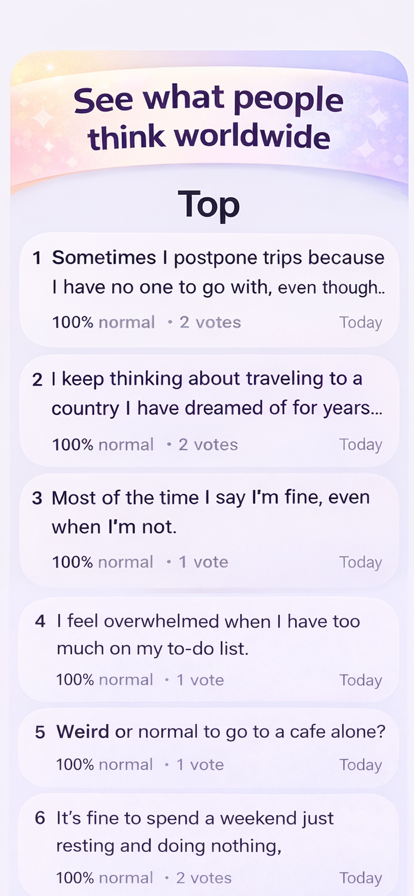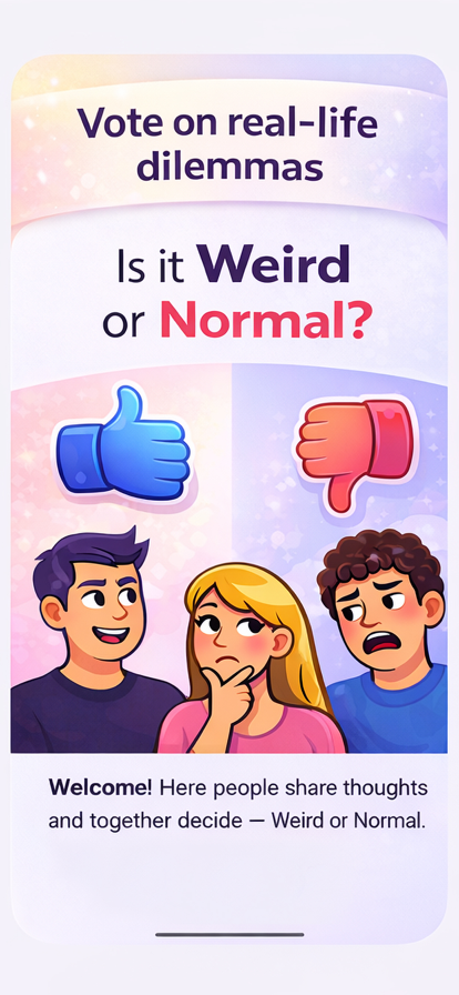 怪异还是正常”是一款社交应用,用户可以在这里分享问题、表达观点,并了解他人的想法。 提出你自己的问题,浏览其他用户的帖子,并参与简单快捷的投票。发表评论,观察观点随时间的变化,看看你的观点是否与大多数人一致,或者是否与众不同。 这款应用旨在促进轻松互动和深入讨论。无论你是好奇、喜欢思考,还是只是想探索一些有趣的事物,“怪异还是正常”都能让你了解不同的人如何看待日常情境、想法和选择。 主要功能: • 创建并分享你自己的问题 • 为你认为怪异或正常的事情投票 • 阅读和撰写评论 • 查看社区结果和评分 • 了解不同用户观点的差异 “怪异还是正常”旨在以简单有趣的方式促进对话、激发好奇心并理解不同的视角。