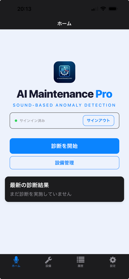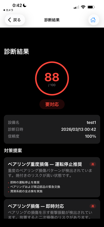 製造現場の「熟練者の耳」をAIで再現。お使いの設備の正常音をiPhoneで学習させるだけで、その設備専用の異常検知AIを構築できるアプリです。 ■ データセキュリテー 録音した音声データはお使いのiPhone内でのみ処理され、外部サーバーへ送信されることは一切ありません。AI学習・診断はすべてデバイス上で完結します。 工場の稼働音など機密性の高い音響データが社外に漏洩するリスクがなく、情報セキュリティポリシーの厳しい製造現場でも安心してご利用いただけます。 【使い方 — 3ステップ】 1. 設備を登録(名前と種別を入力) 2. 正常音を録音(10秒×3回以上、推奨10回以上) 3. 「モデルを学習」をタップ → 設備専用AIが完成 学習完了後は、同じ設備の音を録音するだけでAIが自動で異常を検出します。 【主な機能】 ■ 設備固有AI学習 設備ごとに正常な稼働音パターンを学習し、カスタマイズされた異常検知モデルをオンデバイスで構築。統計的手法(3σ法・マハラノビス距離)のアンサンブルで、正常・注意・要対応の3段階で判定します。 ■ 高精度モデル — Premium(オプション) サーバー側One-Class SVMによる高精度モデルを追加。オンデバイスモデルと合わせた3検出器アンサンブルで検知精度を向上させます。 ■ AI詳細分析(オプション) Google Geminiを活用し、検出された異常に対する具体的な原因推定と対策提案を生成。ベアリング、ギア、モーター、ポンプ、コンプレッサーなど設備種別に応じた専門的アドバイスを提供します。 ■ PDFレポート出力 診断結果を業務報告書フォーマットのPDFで出力。異常スコア、判定結果、対策提案を含むレポートを共有・保存できます。 ■ 診断履歴管理 過去の診断結果を保存し、フィルタ・ソート・検索機能で効率的に管理できます。 ■ オフライン対応 オンデバイスAIモデルによる録音・診断はインターネット接続なしで利用可能。現場での即座の判断をサポートします。 【こんな方におすすめ】 • 製造設備の保全担当者 • 設備メンテナンス業者 • 品質管理部門の方 • 中小製造業の経営者 【対応設備】 ベアリング、ギア、モーター、ポンプ、コンプレッサーなど、稼働音を発する回転機器全般 ※基本的に正常音(通常稼働音が取得できる設備であれば全てに対応可能です) 【料金プラン】 • 基本機能: 無料(設備登録・AI学習・診断・レポート出力・履歴管理) • AI詳細分析: アプリ内課金(買い切り) ※本アプリの診断結果は参考情報です。重要な設備判断には専門技術者による点検を併用してください。 【AIモデルテストに用いたデータセット】 MIMII Dataset: https://zenodo.org/records/3384388 論文: https://arxiv.org/abs/1909.09347