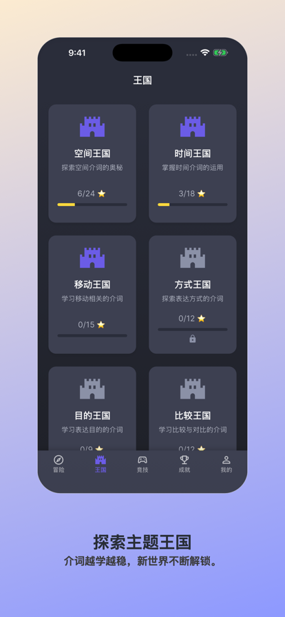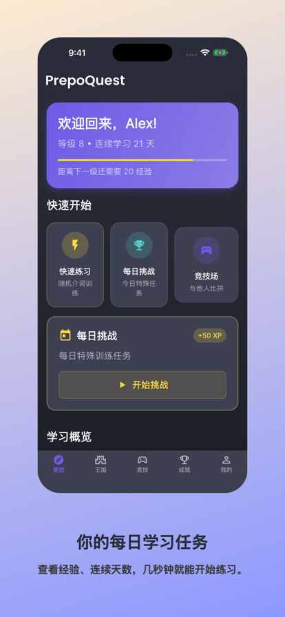 别再靠猜来用英语介词了。现在开始真正用对它们。 PrepoQuest 专注攻克英语里最容易出错、也最让人头疼的部分之一:介词。 如果你总在 in、on、at 之间犹豫不决,常常搞混 to、for、with,或者总会犯一些小语法错误,让表达听起来不够自然,这款 App 就是为你准备的。 无论你是英语学习者、备考用户,还是希望写作和口语更自然的人,PrepoQuest 都能把枯燥难记的介词学习,变成更清晰、更有成就感的进步过程。 为什么大家喜欢 PrepoQuest 专练最容易出错的介词 重点覆盖英语学习者最常犯错的介词用法,包括时间、地点、移动、方向以及真实语境中的句子表达。 不是死记硬背,而是真正理解 用通俗易懂的讲解、实用例句和即时反馈,帮助你明白为什么答案对、为什么会错。 用游戏化进度保持动力 在不同主题关卡中逐步推进,完成任务、解锁成就,并通过每日挑战保持学习节奏。 为真正进步而设计 无论你是在准备雅思、托福,提升学校英语成绩,还是想让日常表达更自然,PrepoQuest 都会帮助你在语境中掌握介词,而不是孤立地背规则。 你将获得 • 500+ 精选介词练习 • 简洁清晰的英语语法讲解 • 真实场景例句与语境练习 • 从入门到进阶的难度设计 • 即时反馈,帮助加深记忆 • 每日挑战与成就奖励 • 根据学习表现调整的个性化进度 付费精品体验:一次购买,无广告、不打扰 PrepoQuest 是一款为认真学习者打造的付费 App。 • 永久无广告 • 没有弹窗与干扰 • 支持离线学习 • 练习次数不限 • 更深入的学习进度统计 • 更专注、更高质量的学习体验 适合这些用户 • ESL 英语学习者 • 雅思 / 托福备考人群 • 想提升语法和写作的学生 • 希望英语更自然的职场人士 • 总是在介词上出错的人 介词看似小,却会明显影响你的写作、口语和理解能力。 现在下载 PrepoQuest,把英语里最容易出错的一环,变成你的优势。