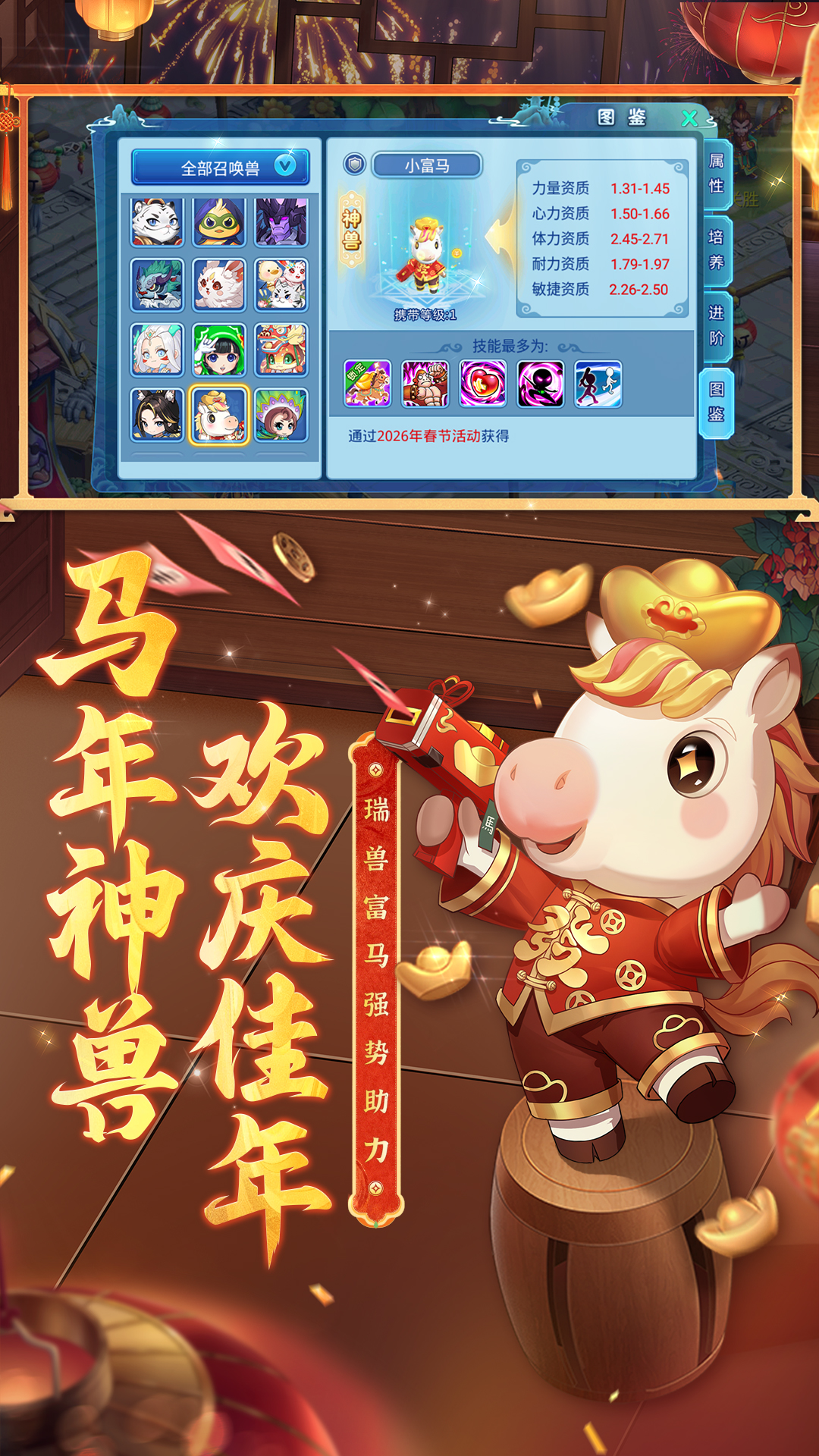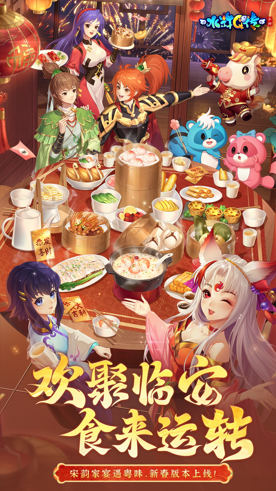 春节资料片将于2月5日正式上线,水Q围绕“宋韵家宴遇粤味”主题展开一系列新春佳节活动,让大家福利满载快乐过年!全新马年专属神兽—小富马闪亮登场!“粤味美食”主题系列外观上线!带来新年新气象!荒野活动组队玩法限时开启,共同感受春节的热闹气氛吧~<br><br>《水浒Q传》手游由奥飞游戏和火石软件联合打造,是一款继承了《水浒Q传》端游经典玩法,并融合手机游戏特性的Q版回合制MMORPG手游,广受当下回合制玩家喜爱与好评。<br>游戏秉承一贯的Q萌画风,十大职业并肩出战。玩家可以在炫彩国风的水浒世界体验到三系技能养成,萌宠神兽进化合成,神工装备手工打造,108星将轮番助战等核心玩法。还能通过排位竞技巅峰对决和全新的GVG-MOBA帮派联赛获得更高阶的游戏乐趣!