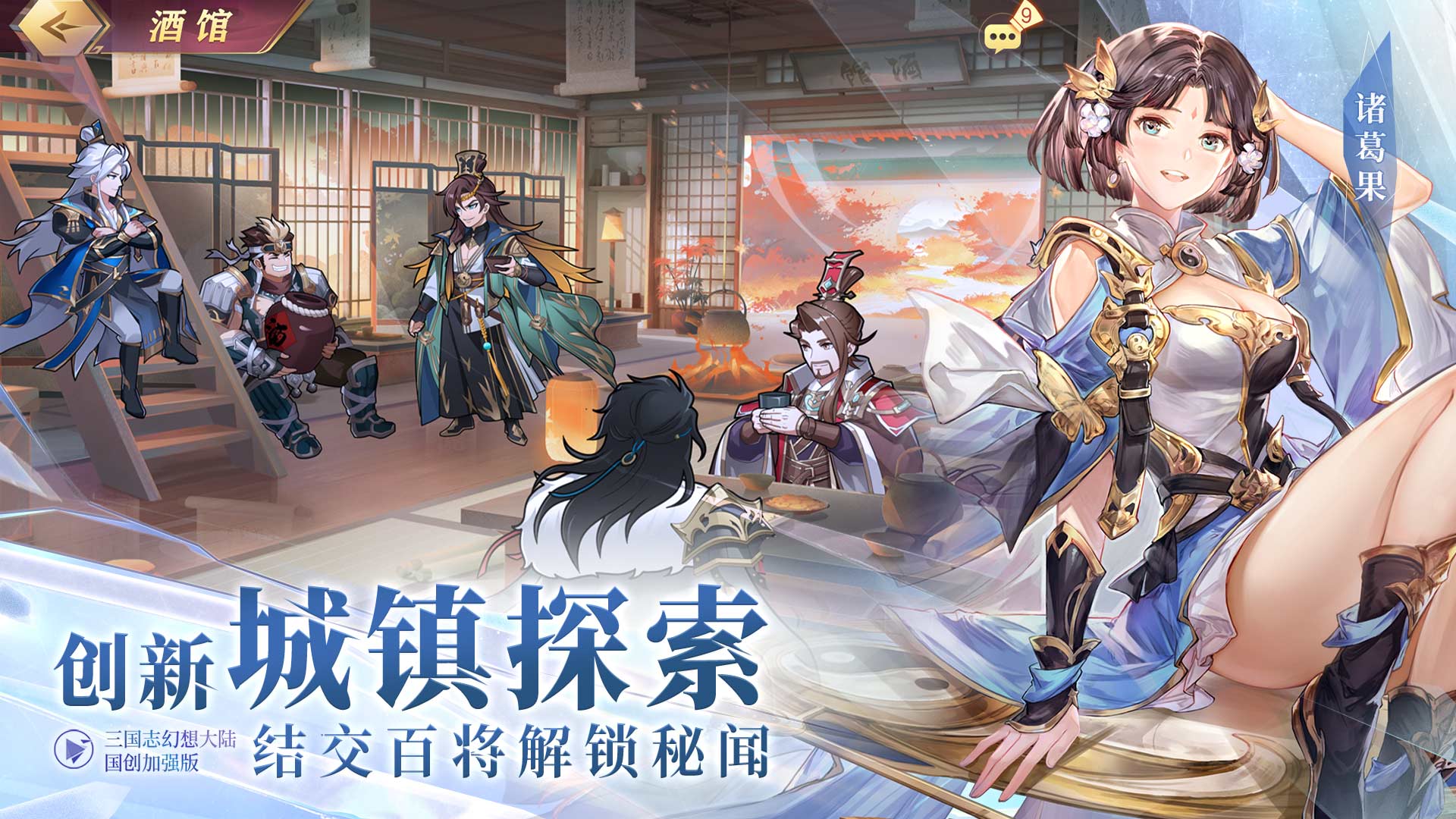 纷纷扰扰三国一梦,再启波澜壮阔幻想之旅。 高颜值国创卡牌《三国志幻想大陆》融汇幻想与历史,重构有温度的三国世界。多种革新玩法,一键零损换将,养成资源都能继承,新武将抽到就能上场。告别品阶碾压,全系武将都能觉醒至无双,你喜欢的都能成为C位! 【幻想三国 清河烟火】 三国武将齐聚清河郡,探索百将相伴的理想乡 小酒馆,与桃园三杰不醉不归;舞台下,一赏江东芳心纵火团的歌喉;温泉里,遇见沉迷搓澡的曹氏一家; 作为清河郡的小将军,你可以与心仪武将出游探险、温泉泡澡,更多惊喜与秘闻亟待你来发现 【武将觉醒 人人无双】 人人都能主宰战场,你喜欢的都能成为C位 打破初始品阶限制,无论良将神将,都能焕发更强力量,提升至无双品阶 乱世之中名留青史者,都是任你招募的豪杰 【新将入阵 直接上场】 新阵容新武将零负担尝试,养成继承不用重新培养 首创“零损换将”机制,上阵武将的等级装备都能全员共享 心仪武将即刻上阵与你并肩作战,尽情沉浸幻想冒险 【跨国搭配 随心应敌】 三国武将们联手出击,羁绊自由组合华丽共斗 过往的相逢恨晚、一生之敌、君臣挚友,都能突破阵营桎梏,此刻化作更强战力。 灵活运用计策,巧妙搭配阵容,解开笼罩三国的层层谜团。
