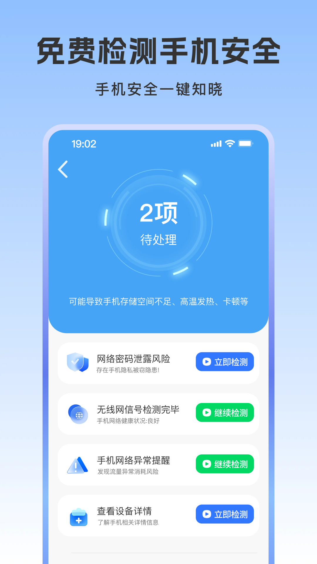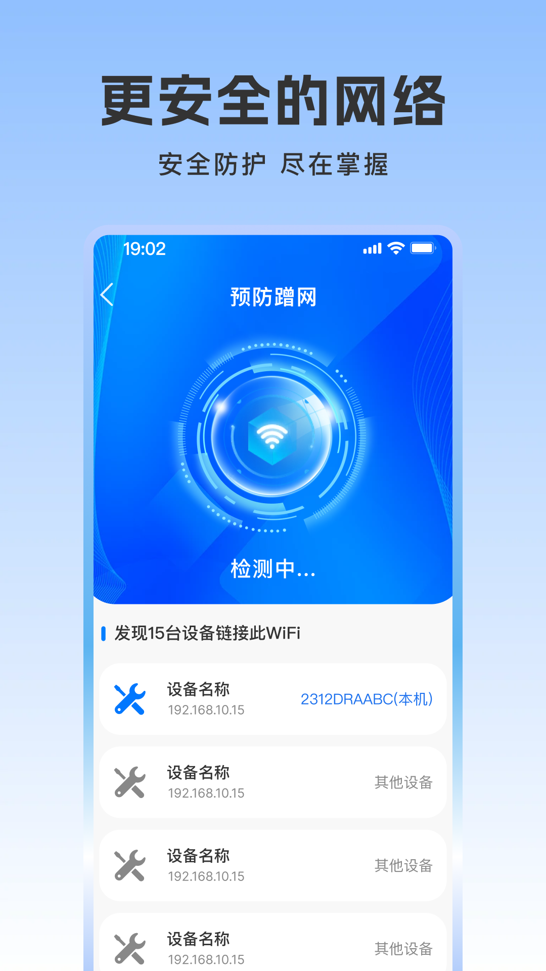 一款手机WiFi管家助手软件; 功能丰富且实用,多款WiFi功能让您更好的使用并了解您的WiFi; 网络安全、防蹭网、网络测速等功能,帮您随时了解WiFi网络情况。