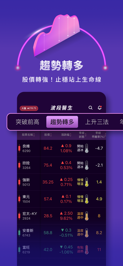 波段醫生【主力魔法均線】APP:最簡單又絕無僅有的技術分析,以獨創「魔法均線」參數設計四大選股、搭配「季線溫度計」在對的時機佈局! 【選股】突破前高 股價開始溫和放量上攻並且突破前高壓力,有機會形成較大的波段行情,但要注意不可以乖離長天期均線太遠!(急漲遇到前高反而容易出現解套賣壓) 【選股】趨勢轉多 股價轉強站上生命線!多方趨勢個股拉回修正後股價開始止穩回升,有時候剛站上生命線還會出現震盪整理型態,例如:W底或是箱型整理,待趨勢轉多後即可列入觀察名單。 【選股】上升三法 上升三法是指:兩根長紅K棒中間夾雜幾根小紅、小黑量縮整理,中間的量縮震盪是可以佈局介入的機會,但剛突破整理區間或是型態的第一個上升三法勝率最高,股價越漲越多後,這個型態的勝率就會慢慢下降。 【選股】年線戰法 股價長期在年線下方,打底後開始向上挑戰年線,絕大多數的強勢股大行情都是從站上年線後開始,但是站上年線也未必會馬上開始上漲,有時候會經過一段時間的震盪和整理。 【指標】季線狀態(溫度計) 以「季線乖離率」為核心指標,區分為「開始退冰、慢慢增溫、溫度適中、有點過熱」共四種狀態,讓使用者可以快速判斷出目前股價趨勢為何。 【福利】VIP 社團 軟體內建 VIP 社團,專屬訂閱會員的討論區,除了能在這裡與各路高手互相交流之外,波段醫生也將不定期分享個人投資見解、交易心得。 【福利】內容專區 收錄波段醫生所有的教學內容,也包含每月額外贈送給 VIP 會員的 4 篇專欄文章、4 部影音教學。