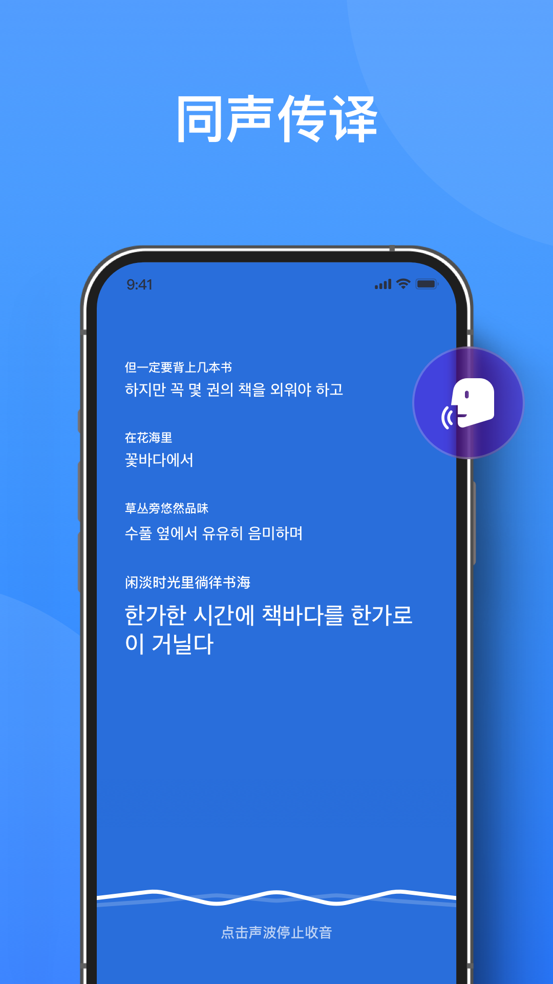 极简匠心,免费无广告。大王卡免流系应用。支持英/日/韩/西/俄/法/德/泰/越/印尼/马来/意/葡/土等多种热门语言翻译,支持语音翻译、同声传译、文本翻译、实景AR翻译、口语评测等功能。获得2018「WMT国际翻译大赛」中英翻译冠军,日均翻译量已破 5 亿!满足翻译学习、口语练习、出国旅游、日常交流等需求。 更懂国人语言习惯,采用先进的神经网络机器翻译引擎NMT,BLEU评测和专业人工评测,翻译质量领先行业,精准自然流畅。 【深受亿万用户和业界同行信任】 - 博鳌AI同传技术展示方 - 数次荣获安卓应用市场精品推荐 - 爱范儿、少数派、小众软件等权威媒体自发推荐 【主要功能】 * 语音翻译 | 无需打字,对着说话,精准识别并翻译,快拿去与歪果友人谈笑风生吧; * 同声传译 | 免费体验,声画同步,实时翻译,炫酷又高效; * AR翻译 | 对准内容,自动扫描,结果实时实景呈现,所见即所得,翻译路牌、菜单、书籍、作业更省心; * 口语评测 | 拒绝哑巴英语,智能跟读评测,趣味打分; * 全能生词本 | 收藏词句轻松复习,释义、听力、发音一步到位; -------------------- 我们渴望听到你的反馈! 如果你有任何建议或问题,可以发送邮件到translate@tencent.com。
