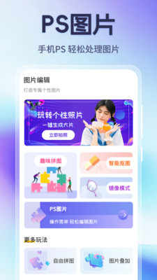 PS图片处理-手机PS图片编辑,一键修图,lr调色。在线快速P图,让你爱上修图。不管是玩自拍还是制作证件照,PS级的强大的图片编辑功能都能快速美化照片实现图片人像合成,修图、p图、照片编辑、图片编辑等一应俱全,用强大的 AI 照片工具,使用润饰图片。还提供了饱和度、锐度,色调分离和色彩平衡等专业的ps调色工具,它是你的手机里的Photoshop,让你随时随地 拿出手机就能进行专业的图片编辑,轻松美图P图!。我们致力于提供手机上图片拍摄、美化和分享的一站式图片服务。 核心功能体验: =专业相机= 提供多种拍摄模式,多种分割线样式,助力拍摄绝美照片,满足你不同的拍摄需求。 =图片编辑= ps提供了强大的编辑功能,海量的滤镜,抽象化,漫画风等功能一应俱全,精细的抠图,背景分离等功能让您爱上玩图。 「滤镜调色」 一键轻松改变照片的氛围和风格。包括复古、黑白、电影胶片、HDR、暖色调、冷色调在内等多种风格选择,满足不同场景的需求。即使是新手用户,也能轻松塑造完美照片,随心所欲地生成各种写真大片,提升照片质感,赋予独特的艺术风格。让您的图片更具魅力。 「图片调色」内置专业的调色工具,帮助你精细调整照片的色彩,创造理想的视觉效果。调色功能涵盖亮度、对比度、饱和度、色温、色调等基本调整,同时还提供阴影、高光、色相等高级调节选项。可以通过滑动调节每项参数,使照片的色彩更自然、层次更分明。无论是细腻的色彩校正还是大胆的风格化效果,调色功能都能满足您的创作要求 「智能调节」 图片色彩一键调整,拯救废片,让图片重新焕发光彩。图片模糊度调整,让你的图片充满朦胧感。 「分辨率调节」能够将低分辨率图片放大,同时保持清晰度,自由调整照片的像素尺寸。让你的照片细节更丰富。 「图层处理」不论是贴纸还是贴图,文字还是水印,创造专属于你的照片秀。让照片更生动有趣。 =图像处理= 提供了专业PS级修图功能,让你轻松上手 进行图片编辑、一键抠图、修图。 「去水印」运用智能AI擦除技术,轻松擦除照片中的瑕疵和不需要的物体,照片更简洁。支持图片去水印、选择图片一键添加去水印框,一键生成去水印照片 「智能AI抠图」游客照背景太乱,想抠图却无从下手?发丝级抠图神器,一键扣出图片中的人物,动物,产品,图章等内容。通过智能AI抠图技术,可以轻松去除照片背景,换个背景,让你的照片立刻焕然一新。 「老照片修复」ps提供强大的Ai修复技术,老照片修复上色,效果自然,还原符合场景的颜色。完美还原其本来面貌。 「照片相框」将您的照片转化为色彩斑斓的艺术作品!精美的相框模板。轻松为照片增添个性与风格,焕发新魅力。千款场景供您选择,原创任用,简单易用的操作界面和多样化的相框选择,快速打造出专业水准的照片效果。为你的照片增添一份文艺气息。 ps是专为爱玩图的你准备的美图软件,操作简单,功能强大。有了这款修图软件,不管你是玩自拍还是制作证件照,都能快速美化照片实现图片人像合成,轻松修图换背景。帮你轻松创作如幻如真的艺术效果,照片编辑从此化繁为简。Photoshop就是你的掌上照相馆,让你抛开繁琐细节、尽情表达个性。