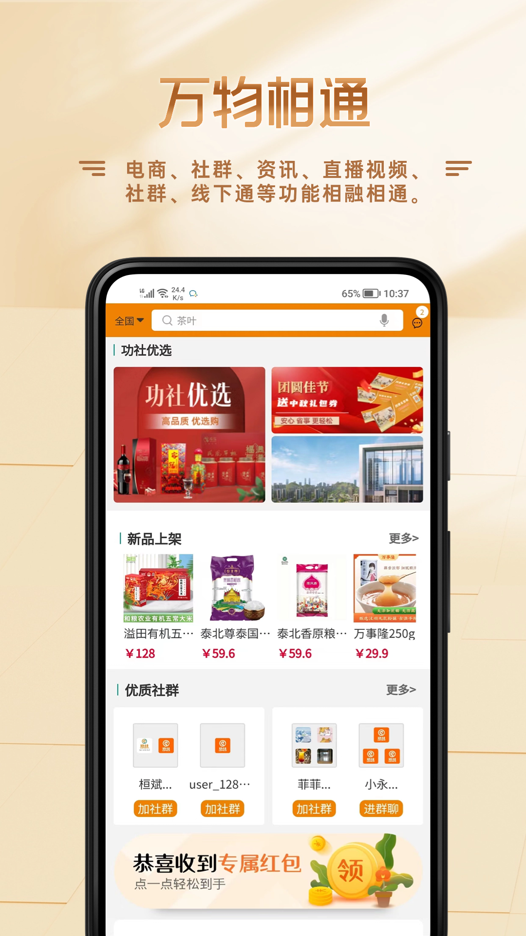功社GSpace新社群消费生态系统是基于互联网大数据时代下应运而生的一项“智社界、融万物、慧生活”创新平台系统,秉承“共享、共生、共赢、共富、共和”的伟大核心价值理念,为用户提供降本增效的高品质产品和服务平台,致力于成为用户“高质量生活助手”。平台始终坚持“强监管、重质量、盯售后、零套路、不坑熟、无广告”的原则打造互联网“客户至上”的“一方圣地”,为用户营造“聊的开心、买的放心、用的安心”的“社群+网商”全新社群的交流及消费体验。 <br> 平台集公众号商城、小程序、PC端、WAP网页版、APP于一体实现五网合一,供用户免费下载注册。平台改变传统的销售模式,利用互联网把店家与消费群体链接在一起,从而为店家与消费群体之间建立完美的供需体系,实现“社群+网商”。平台采用简洁的平面设计,板块分类清晰,无任何弹窗广告,用户可以更方便快捷地浏览信息,免去了很多不必要的麻烦。 <br> 平台涵盖优选购、健药康、慧生活、文教乐、专精特、易定制、线下通、共享链等八大栏目,所有产品及服务经过平台严格筛选,坚持品质至上,杜绝一切弄虚作假行为,并设有完善的售后跟综服务体系时刻保障用户。社群吸引各类兴趣领域群体加入,供用户交流,更有专家及KOL分享知识,以正能量为准则,相互分享学习,赋能个人并获得价值。 <br> 平台将至力于互联网“社群+网商”领域树立“共享、共生、共赢、共富、共和”的标杆,赋能千行万业共生共赢,赋能大众创业万众共富,为国家实现共同富裕贡献应有力量。