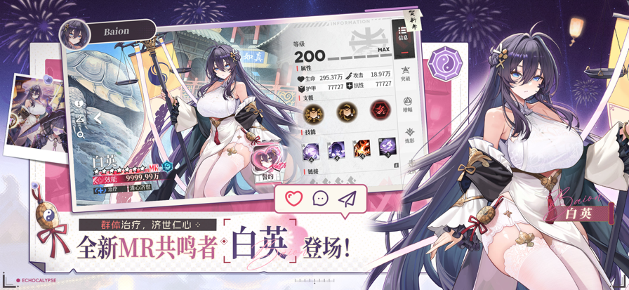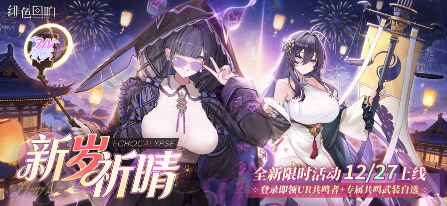 新岁祈晴 元旦活动限时开启 UR自选、全新共鸣者、活动奖励,超多福利等你拿 《绯色回响》元旦版本开启,登录即领UR自选!全新共鸣者,全新玩法,七日签到好礼拿不停!萌新入坑,老友回归,此刻正是好时机! 登录即领UR自选,超多福利送不停 强力UR共鸣者+专属共鸣武装自选登录即送!无论是新手组队还是老手补强,绝佳机会不要错过!更有元旦七日签到,圣诞祈愿抽签活动,元旦社区礼包等超多福利等着你! MR共鸣者「可可佩莉」&「白英」上线 既是全能领域的人气网红,又是四面玲珑的情报人员,腹黑俏皮的「可可佩莉」欢迎你加入她的频道~雷属性热力爆发型MR共鸣者「可可佩莉」闪亮登场,专属时装「沉溺浸礼」同步上架。 归隐深山、清心济世,天然散漫的药师「白英」虽反应木讷,但待人行医认真不苟~水属性清心济世型MR共鸣者「白英」限时登场,专属时装「回春秘药」同步上架。 全新玩法「临界侵蚀」,MR卡池保底升级 “解开限制(UR)的共鸣者进一步解放自己的力量,进入到了接近失控堕落的临界状态(MR),临界状态的共鸣者需要元素锚点来保护自己的意志。”全新元素玩法「临界侵蚀」,击败回响宿体,解决共鸣者们的侵蚀症状!MR卡池机制迎来同步更新,小保底升级为至少UR品质! 缔结心动誓约,独享爱意时刻 每个少女都有独属于她的专属时刻,为她戴上戒指,换上纯白婚纱,缔结你们之间的永恒羁绊!高质量live2D,特殊触碰互动,专属誓约剧情,快来打造属于你和她的心动时刻! 魔女之间特殊玩法,交流互动畅谈情话 曾经与你心灵共鸣的伙伴,在未知力量的侵蚀下,化身成「魔女」,她们等待着你的拯救!独特的对话互动系统,为她们注入灵魂,更有专属剧情,特殊互动等你解锁!
