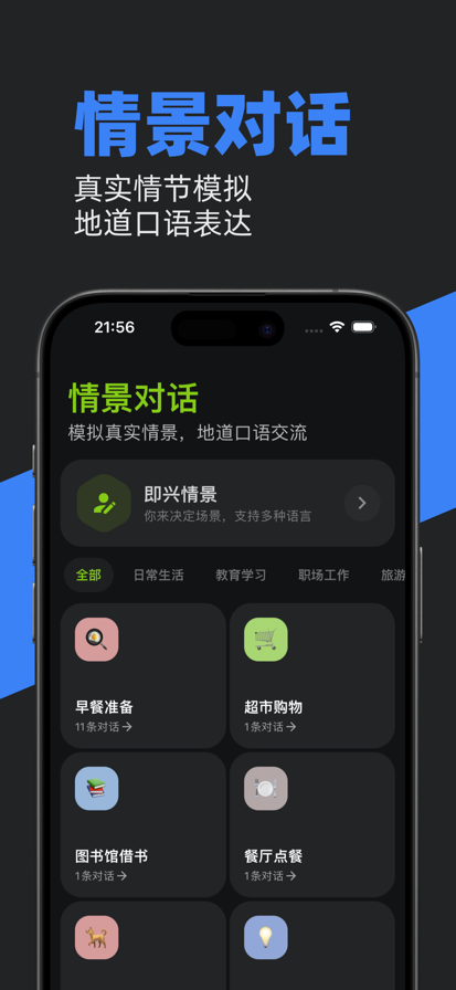 和二次元AI好友一起聊天练口语! 想要练习口语却害怕开口?别担心,快来和我们可爱又迷人的二次元AI好友一起练口语吧!无论你喜欢英式英语、美式英语,还是日语、韩语、法语,我们都能满足你!支持选择对话难度,超多话题可聊,还可以对你的口语发音、拼写、语法等进行智能评分,让你随时掌握自己的口语水平!24小时在线,随时随地练口语,和社恐说拜拜! # 主要功能亮点: - 多核心AI引擎:豆包大模型、KIMI大模型、清华智谱大模型!自由切换! - 多角色陪聊:多个可爱又迷人的二次元角色,不同发音,不同性格,给你真人般的口语陪聊体验。甜美莱拉、御姐佐伊,稳重伊森,都在等着你! - 多语言支持:纯正英式口音、美式口音,甚至日语、韩语和法语,任你选择。无论你是想提升英语口语,还是学习新的语言,我们都能帮你实现。 - 口语发音评测:一键评测评测你的口语发音和语法、拼写,一步步提升口语表达能力! - 全天候练习:24小时随时练习,既能语音交流,也能文字交流,无惧场合,和社恐说再见。无论是早晨的咖啡时间,还是深夜的安静时刻,我们的AI好友都在等着你。 - 灵活对话难度:支持切换对话难度,无论你是口语萌新还是大神,都能找到适合你的对话。初学者可以从简单的对话开始,逐步提升,而进阶用户则可以挑战更复杂的对话。 - 丰富话题:一键获取回复建议,或者切换话题,只要你想聊,就不怕没得聊。无论是日常生活、旅行冒险、还是职场话题,我们都有覆盖。 - 自然翻译:让AI来当你的翻译官,可以将你输入的文字翻译成多种语言,还能指定翻译的风格!对了,还可以拍照进行翻译哦! - 精心设计:使用流畅,界面美观,让你爱不释手。简洁的界面和直观的操作,让你专注于练习口语,提升自我。 # 超多情景模拟,地道口语对话! 上百种真实情景模拟,点餐、烹饪、打车、买东西、问路、面试、开家长会,各种情景模拟,满足你的所有需求!甚至可以一句话创建即兴场景,覆盖你所有的需求!无论是准备旅行、提升职场口语,还是日常交流,我们都能帮你搞定。