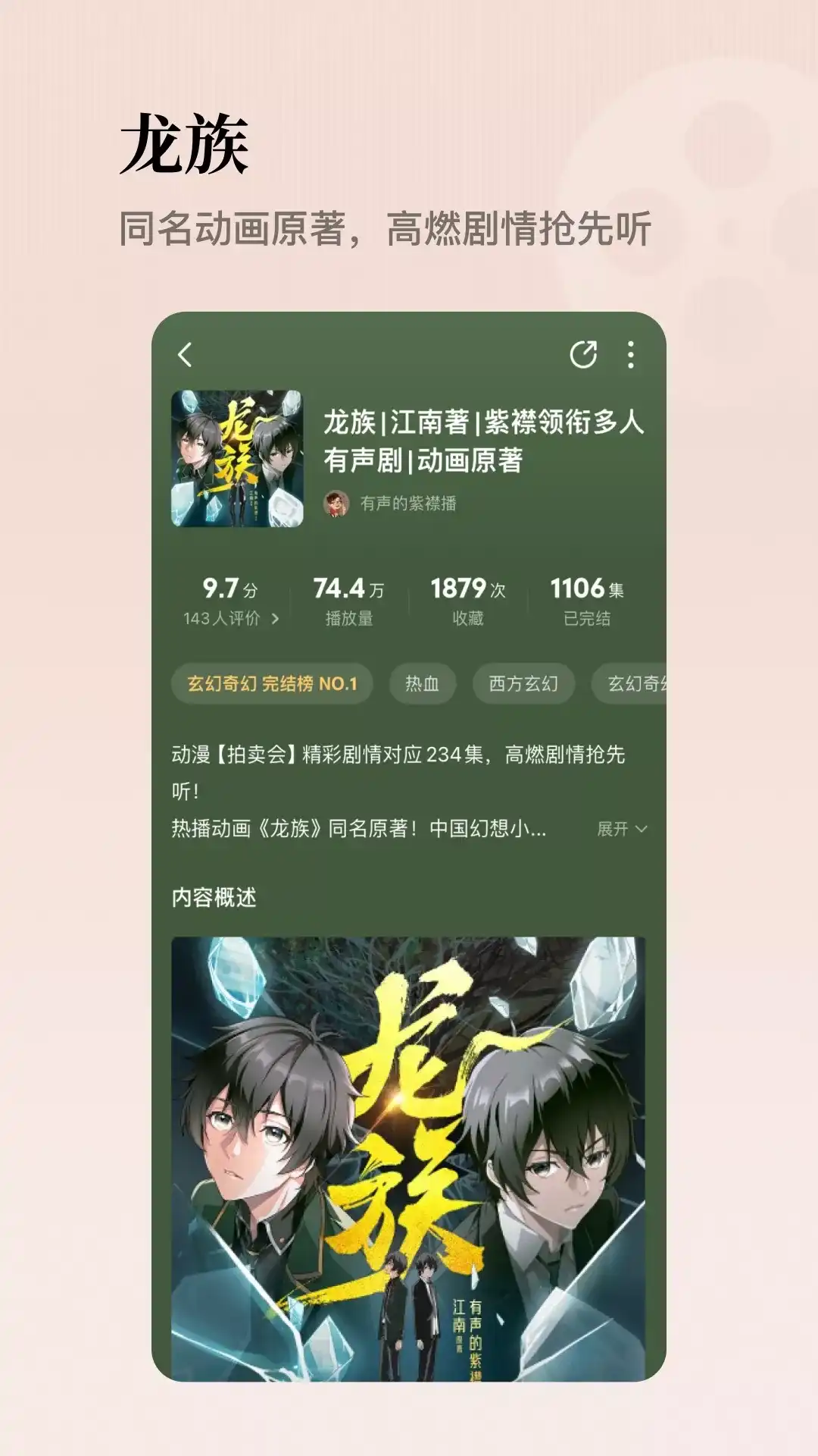 听书、听课、听头条、听知名评书,电子书免费看,海量资源免费畅听,会员畅听,更多用户的选择! 更多的世界,用听的! 冯唐、杨澜、陈美龄、曾仕强、郭德纲、张召忠、老梁梁宏达、朱亚文、百家讲坛,大咖内容等你听! 有声小说、听头条、广播电台收音机、相声小品、评书戏曲、脱口秀、儿童、情感、历史、音乐、文化、播客、助眠解压,世间百态人情冷暖,尽在蜻蜓FM收听! 【热门内容】 好课推荐:杨澜的社交心法、冯唐讲《资治通鉴》、陈美龄的育儿基础必修课......独家收听! 小说:三体、上门龙婿|至尊龙婿叶辰、鬼吹灯全集、北派盗墓笔记、平步青云、茅山后裔、阴阳通灵师、万相之王、闪婚总裁契约妻、农门小王妃、后宫甄嬛传:全六册 头条:天天天下、观棋有语、听风的蚕、察话会、震海听风、心医林霖说、牛弹琴、爱特记者圈、军情观察、新华FM 、环球时报社评 【大咖云集】 冯唐、杨澜、陈美龄、曾仕强、单田芳、蒋勋、张召忠、马未都、张大春、郭德纲、陈鲁豫、许知远、骆新、刘兰芳、杜文龙、齐俊杰、马红漫、洪榕、王冠、姬宇阳、黄磊、陆琪、苏芩、周建龙、万峰、朱亚文、叶文、易中天、乐嘉、杨迪、方文山、毕飞宇、戴锦华、席亚洲