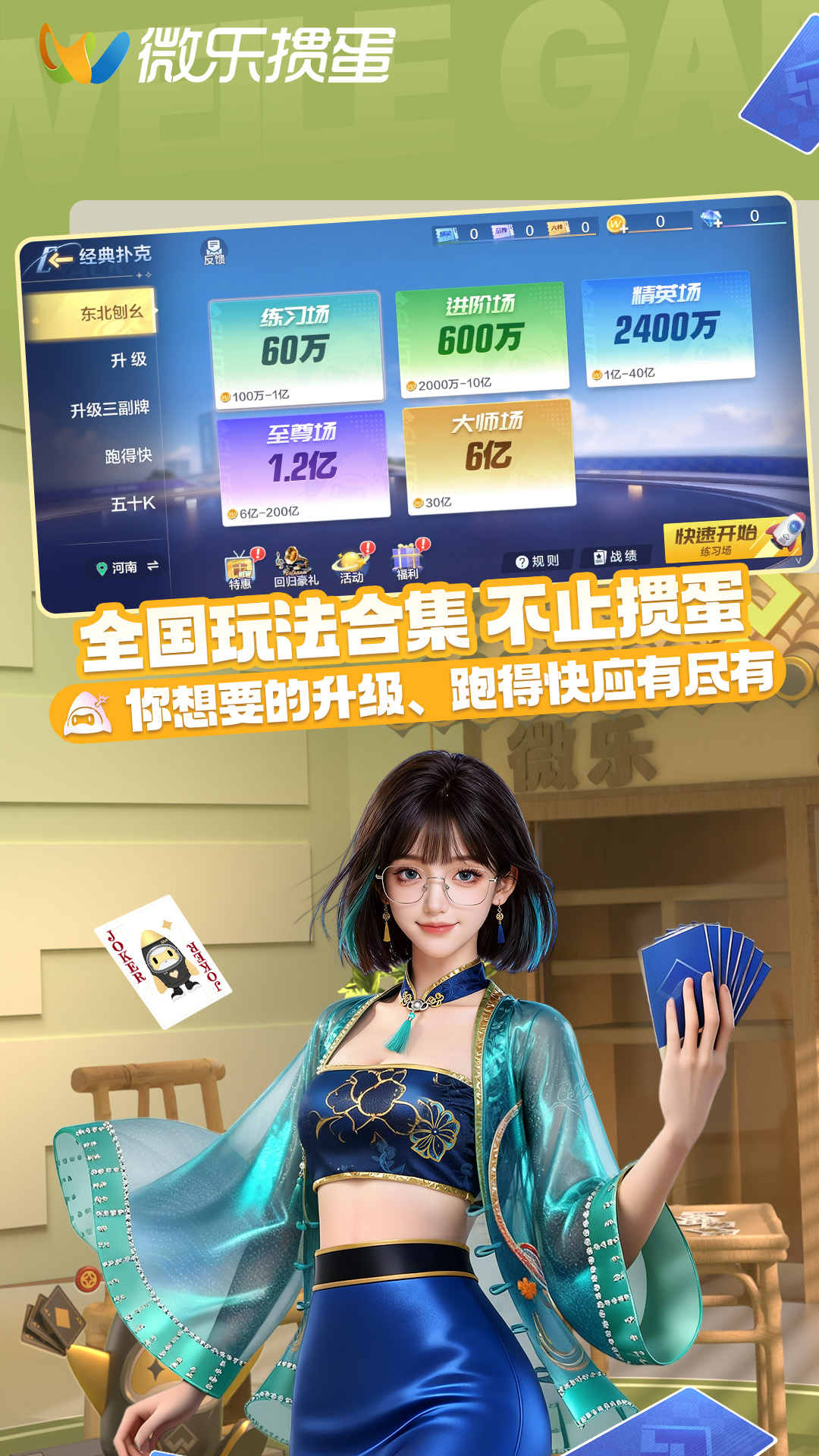 《微乐掼蛋》是一款正宗的掼蛋游戏!<br>轻松好玩易上手,快来一起玩吧!<br><br>【正宗掼蛋玩法】<br>经典掼蛋、免洗、过A多种选择,原汁原味体验掼蛋快乐!<br><br>【丰富地方扑克】<br>掼蛋不过瘾?还有斗地主、升级、跑得快更多玩法等你来玩!<br><br>【海量免费福利】<br>千亿豆精选福利,每天登录就能领,边玩边领爽不停!<br><br>【畅爽掼蛋竞技】<br>高手对决,见证实力,畅爽竞技,争当掼蛋王者!