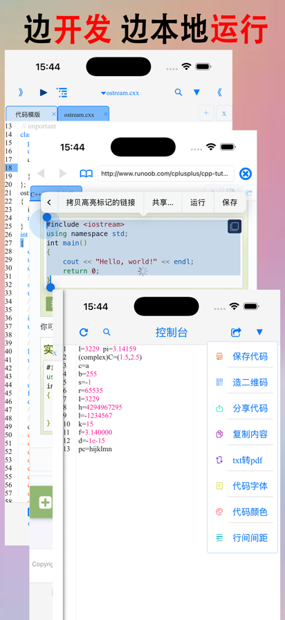 这是一个 C/C++ 高效学习、快捷编程、【离线编译、本地运行】、Git获取、iCloud存取、局域网HTTP FTP 多点连接 高效传输、快乐分享的学习工具。 (^.^)它渴望帮到 想学习、在开发、求进步的您!!!(^.^) (^.^)随心阅读多彩学习资料,边学习边运行实例,易于理解,高效学习。 (^.^)随心使用代码模板、自动联想、自动缩进、代码颜色、符号补全、符号键盘,文本搜索、多文件搜索、多行缩进,多行注解,代码格式化,让开发更便捷。 (^.^)随心 iCloud 存取,多端同步,高效协同。 (^.^)随心Git 获取 gitee.com GitHub 上的源码项目。 (^.^)随心局域网或蓝牙连接,通过HTTP FTP 多点连接 高效传输文件。 (^.^)随心通过内置浏览器查找学习资料,在内置浏览器中选中代码就可运行代码。 (^.^)随心通过文件系统打开c,cpp,txt,pdf,chm,mp3,m4v,zip,gif,png,html,py,doc…格式文件。 (^.^)随心通过文件系统 创建文件夹,创建文件,移动文件,导入文件,导入照片,导入视频,生成音频,生成视频,压缩文件,控制文件排序……。 (^.^)随心用手势【左右滑动】切换界面,方便快捷。 (^.^)随心调整代码颜色,代码字体,字体大小,行间距离,让阅读更舒适。 (^.^)随心控制背景图片,背景颜色,文字颜色,衬托颜色,阴影控制,文字字体,文字大小,背景动画,切换界面动画,主界面标签栏的个数及顺序,打造您个性学习软件。 (^.^)随心把 C/C++ 脚本与学习资料生成二维码,也可以通过扫描二维码获得脚本与学习资料。 (^.^)随心把 C/C++ 脚本与学习资料通过邮件,Weibo,Twitter,Facebook分享。 代码模板——新建文件的内容会复制代码模板的内容。 任何问题或建议请您联系开发者:QQ:1301367159 微信:1301367159