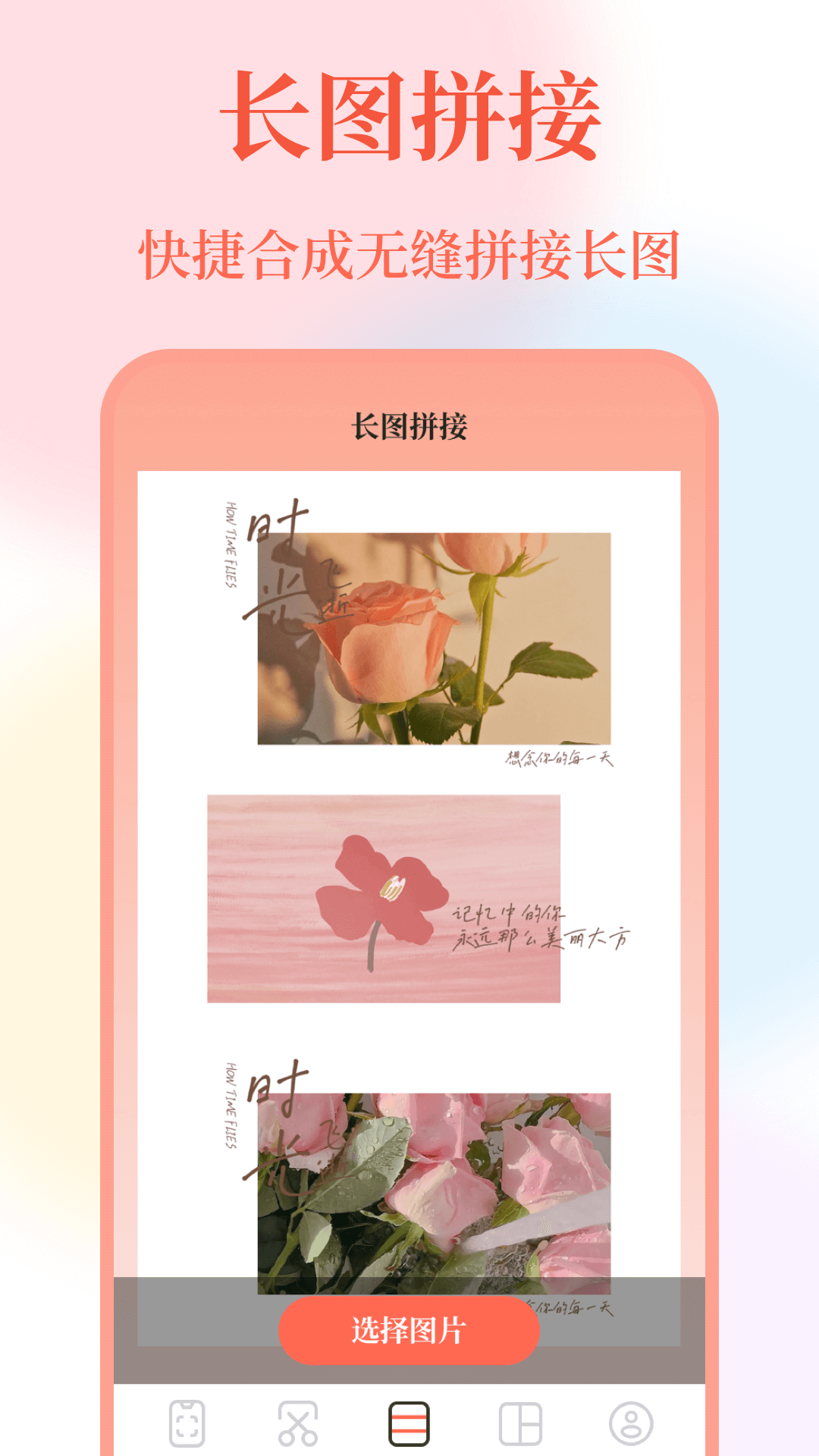 拼长图可以将相片、图片、截图等图片拼接起来,从上到下,从左到右,拼成一幅长图<br>常规拼接:简简单单很实在,包括横向、竖向拼接;旅游记录,聚会记录,将美好回忆画面穿成长图;<br>智能拼接:智能拼接聊天记录,一键生成长图<br>台词拼接:影视字幕随意拼,更方便你借剧抒情。<br>九宫格拼图:一张图片生成九张图片,让你的动态更好看<br>图片马赛克:对于图片中的隐私信息可以进行马赛克遮盖