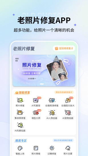 智能修复 · 立等可取 老照片修复 APP 已上线五年, 陪伴超 320 万用户再现旧影风华。未来,我们会持续优化功能,提升修复效果,给大家带来更好体验。 【在线修复老照片】 使用人工智能技术,可以将模糊照片、低清照片、斑驳痕迹修复,并针对面部进行了高清还原修复。 【黑白照上色】 使用人工智能技术,通过大量老照片上色案例,精确还原符合场景的颜色。 【破损照片修复】 对于破损、划痕、折痕、污点或破坏严重的照片,会有专业的人工精修师,手工修复,精修师会最大程度的保留原始照片的形状、细节、神态。精细化处理修复破损照片,让图片变清晰,让照片焕然一新。 【扫描旧照片】 利用尖端的人工智能技术将旧照片一键转变为电子照片,可以有效避免照片形变,照片炫光,照片不清晰等问题。