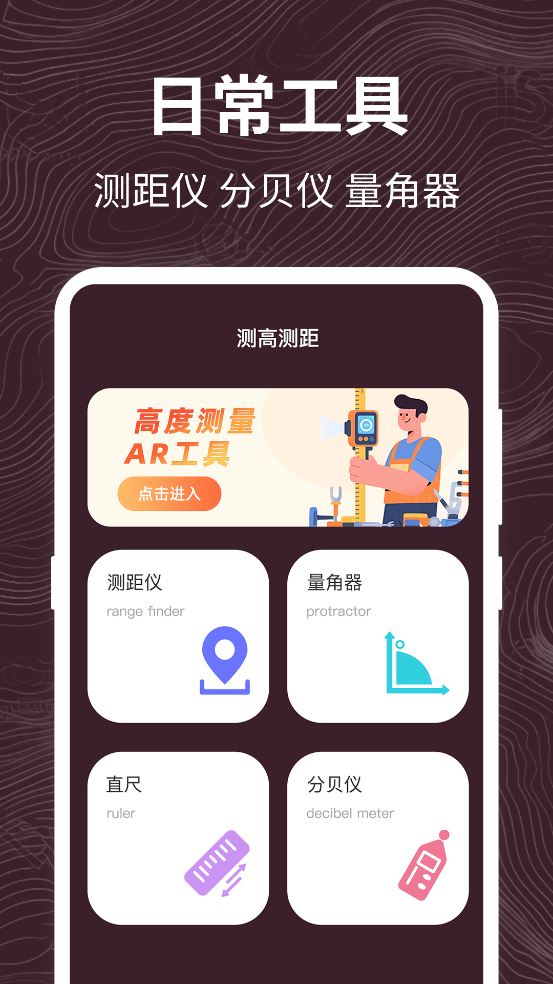 高度测量是一款综合性的方向定位、导航和天气应用,提供GPS定位、海拔测量、经纬度查询以及多项实用工具和信息,为您出行提供方向导航依据 【手机指南针】 结合网络、GPS和手机传感器数据,准确显示您当前的经纬度、海拔和气压。 多款精美的指南针皮肤供您选择,清晰显示东南西北方向,成为您出行导航的得力助手。 【水平仪】检测地面是否处于水平状态。 【天气万年历】 1. 未来天气预报 提供当前24小时内的天气预报,包括气温、湿度、风向等。 查看未来7天的天气概况,以及穿衣指数、洗车推荐和空气质量,助您做好生活安排。 2.万年历 支持吉日、宜忌查询,完美适应中国用户的文化习惯。 提供农历日期显示,方便您规划与传统节日相关的活动。 【多功能测量工具箱】 测距仪:准确测量两点间的距离。 分贝仪:实时测量环境噪音级别。 同时提供量角器和直尺,涵盖您在日常生活中的多种测量需求。