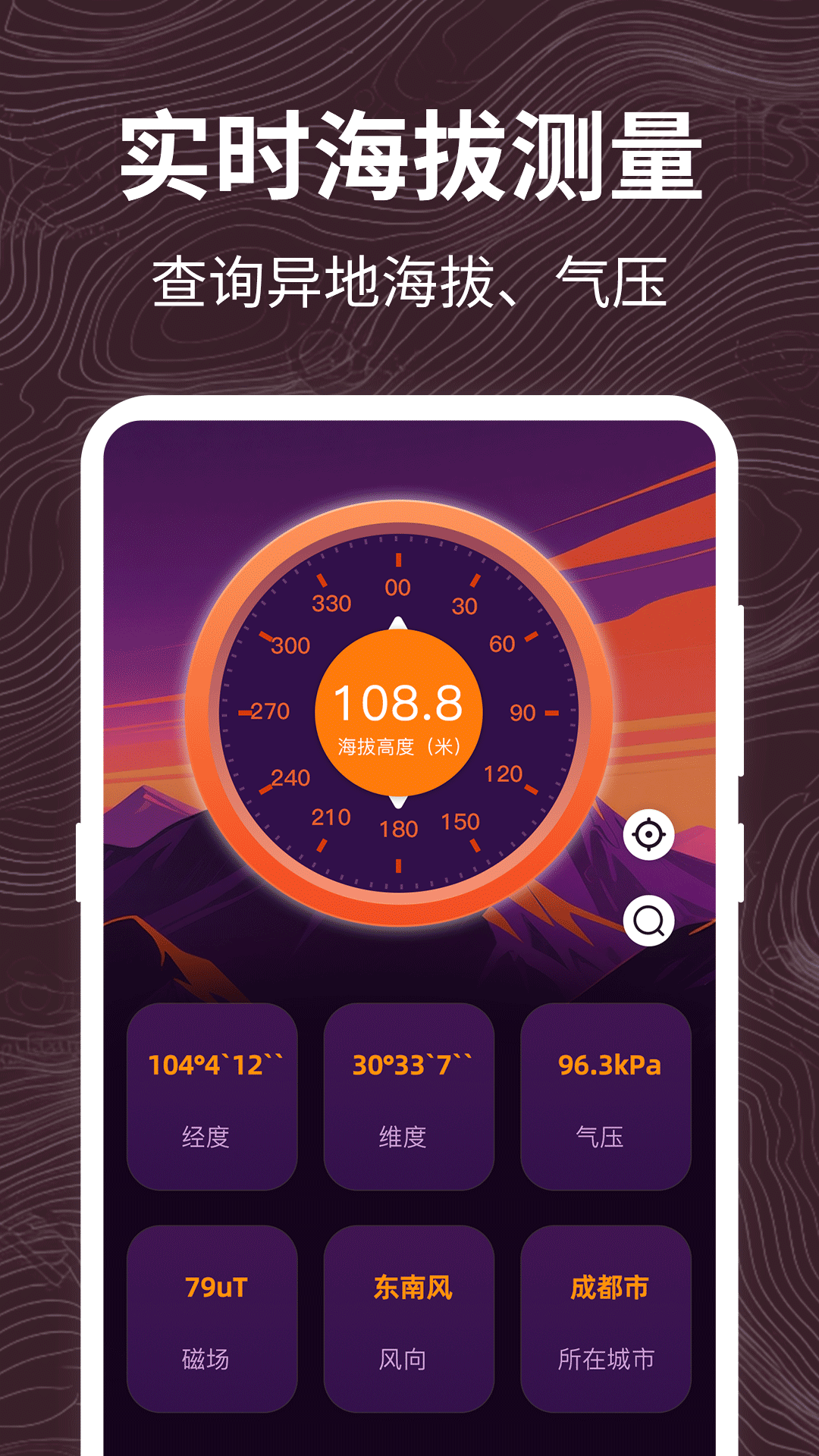 元地球海拔,GPS海拔高度是一款可异地海拔查询的gps工具箱软件,离线无网也可使用,帮助您在自驾游、爬山过程中实时关注海拔,时刻注意高反风险! 主要功能: 1.GPS/气压测海拔(离线可用):通过手机GPS或气压传感器(需手机硬件支持)获取实时海拔,测量位置、经纬度,更有含氧量,气压,湿度,气压值,风向等天气数据,气压测海拔支持室内测量海拔。 2.异地海拔、含氧量查询:单击地图即可知晓异地海拔含氧量,无需实地测量即可知道海拔,自驾海拔地图旅游攻略规划好帮手! 3.户外工具:指南针:无信号状态也可以指明方向经纬度,速度,磁场强度信息;水平仪:测量垂直,水平度数。 4.水印海拔相机:可以给图片添加当前海拔、含氧量、天气、经纬度、湿度、气压值、地点、时间信息,也可以直接给照片添加信息。 5.单位切换:实时海拔高度单位,经纬度坐标的单位,气压单位。 6.地震预警:各地地震情况实时了解。 GPS实时海拔高度,伴您自驾游!