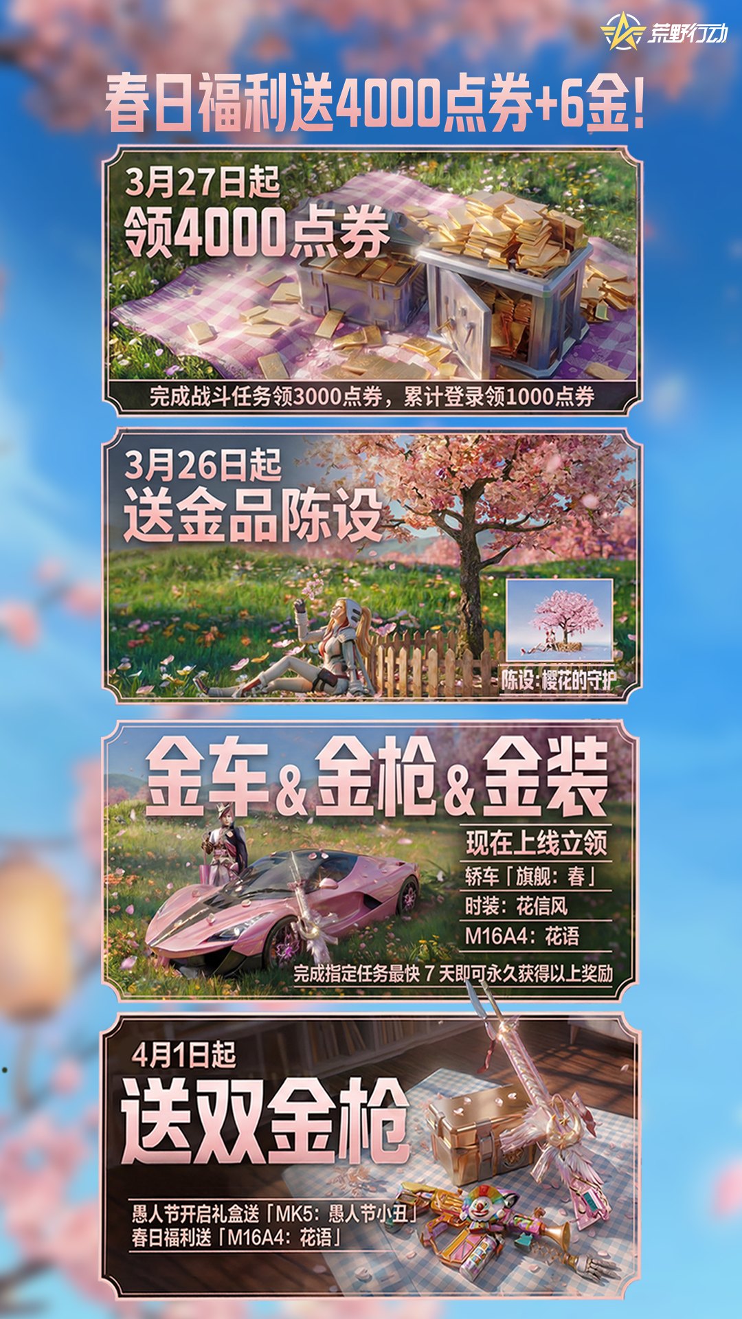 7周年福利重磅来袭!史无前例送金车!<br>金车、金枪、金装全套安排,邀请好友必得金车,安排!<br>全新大口径枪械SACR-H登录荒野!来感受全新的火力压制!<br>想知道在空舰上刚枪是什么感觉吗?全新周年庆玩法【空舰激战】正式上线!<br>荒野新生,“金”喜突围,10月26日等你来上线体验!<br><br>【起飞!目之所及皆可抵达】<br>百人超大地图,跃入荒野世界里自由探索属于你的求生之路<br><br>【生存路上 与同好不期而遇】<br>玩得开心,聊得更开心<br><br>【最深的友情 是一起活下去】<br>与知心好友在荒野默契配合,共享战斗快感<br><br>【超酷跑车 带上队友一起飙】<br>开启全队的极致速度<br><br>【用个性穿搭 遇见特别的人】<br>潮流单品风格多变,随心搭配