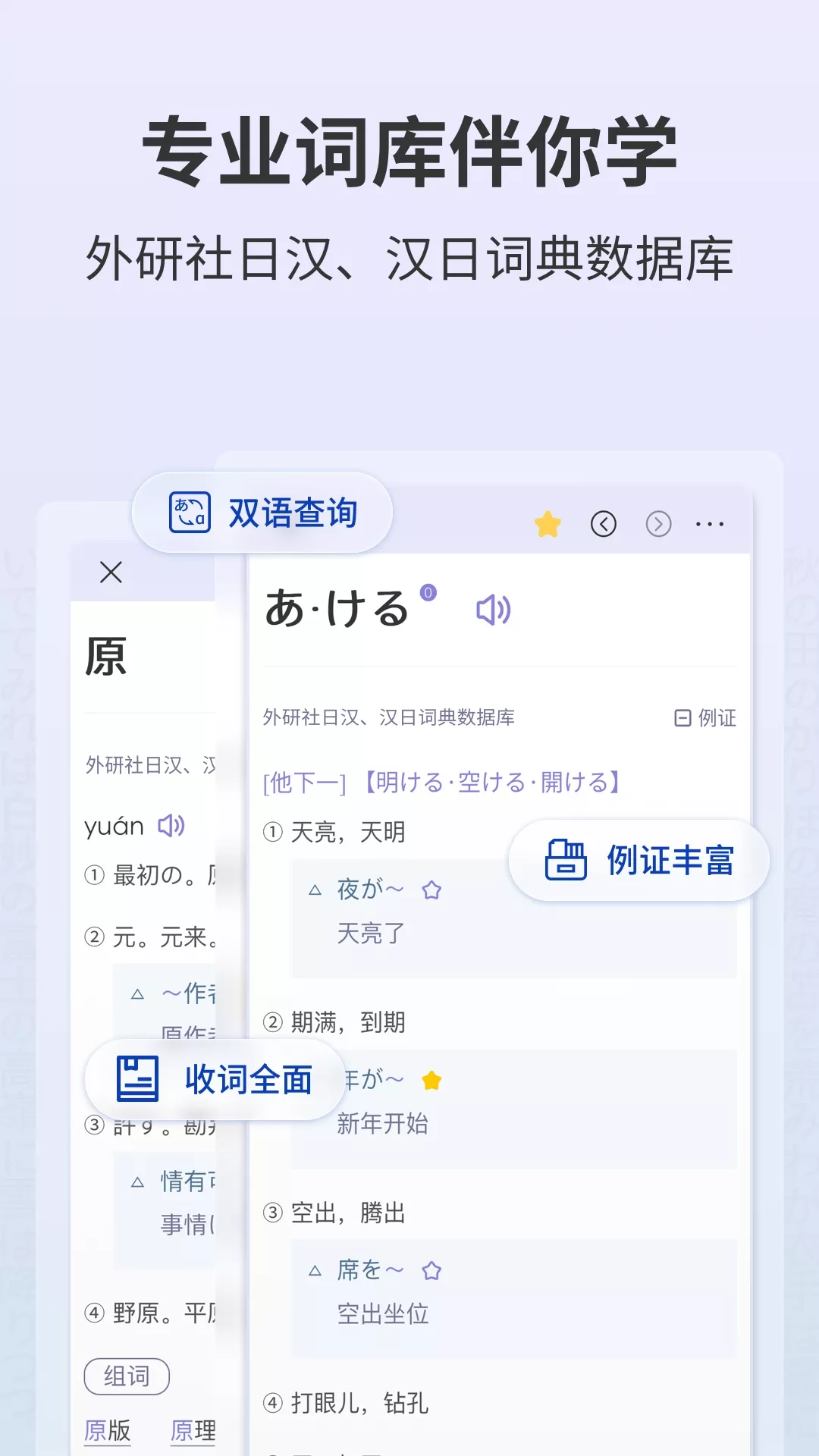 与其他日语学习软件相比,本应用具有五大特色: ①外研社携手海笛出品,著名品牌有品质保障; ②独有的以外研社日汉汉日词典数据库为基础; ③与日语教学教材相结合; ④内容丰富功能全面,可查单词、查日语例句,还能背单词、练口语等; ⑤特邀教师录制视频课程,讲解日本财务知识与日本职场常识、礼仪等。 【日语教材配套资源】 全新开设学习栏目,新增《你好!日语》系列、《日语会话基础篇》、《新日语会话商务篇》、《新大学日语四级全真模拟试题》配套免费音频资源。 【收词全面领域广泛】 词库规模宏大,优选各级各类约20万词目;所收录词汇以语文学科为主、兼顾百科。 【五十音图轻松入门】 专为日语初学者精心设计五十音图卡片,包含假名的发音、书写、罗马音表记方式等,同时配套高校日语专业教授精讲视频,手把手教会你五十音的写法和声调。 【口语达人专注强化】 8个主题、55个热门话题,分场景提供日语发音练习素材,助你身临其境地感受日语思维方式、学习日语口语表达。 【独有专项视频课程】 特邀教师录制《日式簿记基础教程》和《日本商务礼仪》两大系列视频教程,详细讲解日本职场相关知识。 (版权所有,盗版必究)