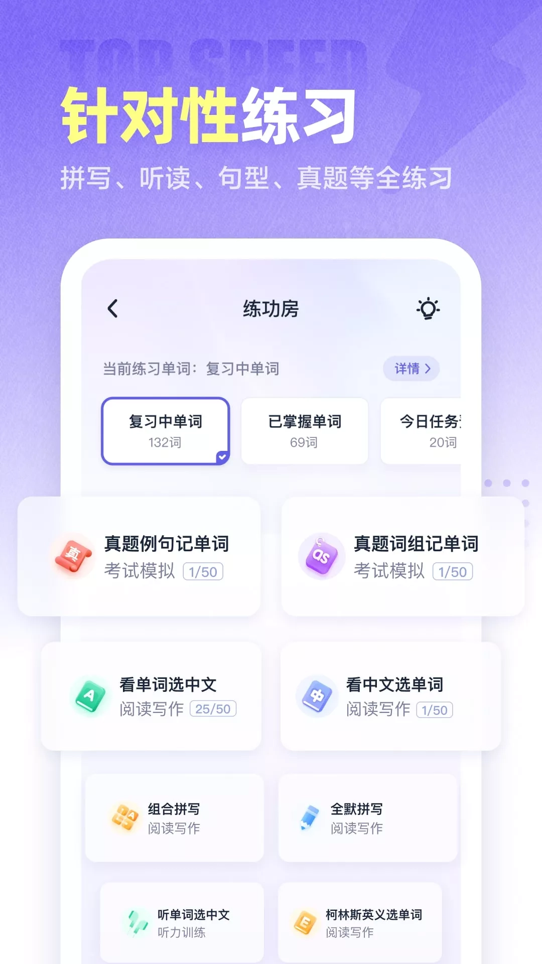 不背单词是一款真实语境学单词神器。 这里有专为英语考试定制的一站式解决方案。在海量有声例句创造的真实语境中,词义和用法被精准呈现,智能记忆算法,让你真正科学高效地掌握单词。 「 高效刷词备考,我有 4 大法宝 」 - 考义:真题考义加粗标注,记忆有重点 - 考点:单词 & 真题词组配套学,一次学习,双重回报 - 考频:单词考频一看便知,合理分配学习时间 - 考题:随时查看真题例句,实战演练考试不慌 「 真实语境记单词 」 - 150万+ 条原声例句,出自你喜欢的剧集、电影等真实语境 - 地道词组搭配,解读词义、体现用法,打造“最小语境” 「 丰富的学习内容 」 - 2000+词根词缀,覆盖近 2 万词条,追根溯源深入解析 - 5500+派生词汇树,以熟词记生词,加深理解高效记忆 - 柯林斯双解词典,豆瓣评分 9.7 的学习型词典 「 全面的单词词书库 」 - 小学/初中/高中/四级/六级/考研/托福/雅思/专四/专八/专升本/日常生活/商业法律/人文社科/朗文/COCA/BEC/GRE/SAT/GMAT/MBA/托业等权威词书任你挑选 「 巩固记忆有绝招 」 - 独特拼写测试,学完一组动手拼写强化记忆 - 记忆算法智能安排学习,在遗忘临界点提醒复习 - 单词随身听记,高效利用碎片时间 「 拯救学习拖延症 」 - 签到学习送大把酷币,背单词不犯拖延症 - 不定期组队打卡活动,充分调动学习积极性 「 我们还有什么? 」 - UI 简洁 ,操作简易,专注学习,不受打扰 - 客串壁纸App,每次学习都有惊喜 - 主题明亮/深邃/极夜三种可选,支持跟随日出日落切换 「 不背成绩单 」 - 50000+五星好评 - App Store 首页通栏推荐 - 金米奖 - 至美奖 - 小红花奖 - 设计奖 「 不背成长关爱热线 」 - 微信公众号:搜索「不背单词App」 - 官方 QQ 交流群:758465732 - 新浪微博:@不背单词App - 不背单词应用内:设置-帮助中心