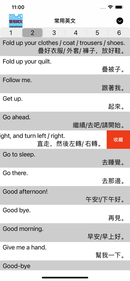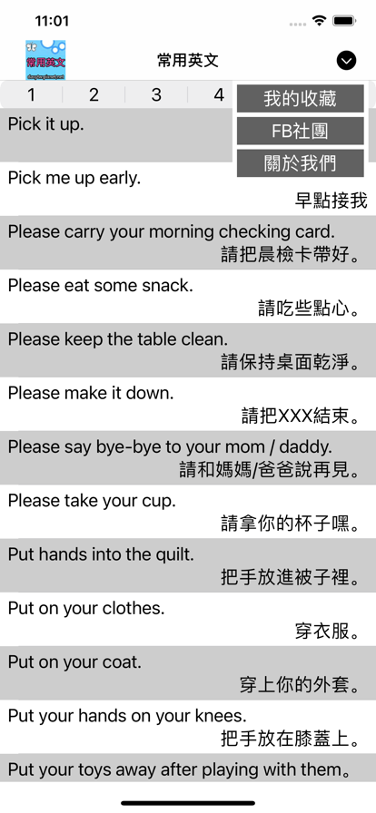 本APP分為6個segment,每一個segmemt包含50句英文句子,點擊句子後會產生英文語音,向左滑動可以將句子收藏在“我的收藏”。點擊頁面的右上方圖標會產生3個按鈕,分別為“我的收藏”、“FB社團”、”聯絡我們“,點擊後分別進入該頁面。 "我的收藏"頁面中,可以看見使用者所收藏的句子,點擊後可以產生語音,向左滑動可以刪除句子。 “FB社團”頁面中,會連結至外部網頁FaceBook,這是我們所經營的FB社團,會定期提供學習英文的資訊,並供應使用者討論英文方面的知識。 “聯絡我們”頁面為本地端html檔,內文中有多個連結,為本社團所有之作品,為使用者提供多元服務。