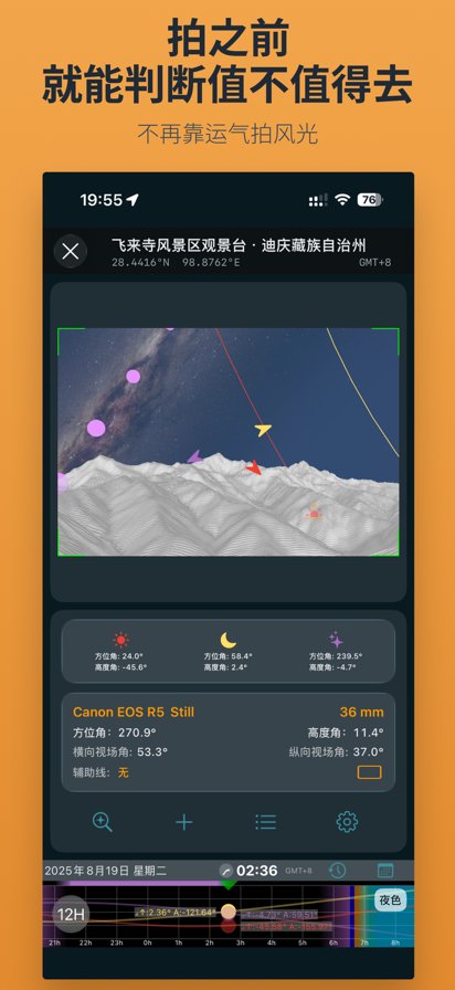 每一张令人难忘的风光照片,背后都是时间、光线与天象的共同作用。真正的难点,往往不在于拍摄技巧,而在于:是否在正确的时间,站在了正确的方向上。 风光摄影助手,正是为此而生。 它是一套帮助你理解光线节奏与天象变化的摄影规划工具,让你在出发之前,就能对拍摄时机做到心中有数。 在免费版中,你可以获得完整而实用的基础能力,用于判断一天中哪些时间段值得关注、哪些方向可能出现理想光线。 你可以通过时间轴,在前后一定时间范围内拖动查看太阳、月亮与银河的位置变化,快速理解它们在一天中的运行节奏。3D 指南针以直观的方式呈现天体方向与高度,让光线不再只是抽象的数据,而是清晰可感知的空间关系。 在 AR 模式下,你可以提前看到太阳、月亮和银河在真实环境中的位置,帮助你理解它们与地形、建筑之间的相对关系。应用还会清晰展示日出、日落、金色时刻、蓝色时刻、天文薄暮等重要星历信息,并支持将关键时刻添加到系统日历,方便你提前规划出行。 这些功能可以帮助你建立对光线与时间的基本判断,减少盲目等待,让拍摄更有方向感。 当你希望进一步提升判断精度、进行更深入的拍摄规划时,可以选择订阅 Pro 功能。 订阅后,你将解锁不受限制的时间轴,预测任意日期、任意时刻的天体位置;解锁完整的 AR 创作能力,包括星轨模拟、取景器模拟、日月搜索、山峰识别以及彗星位置预测;解锁地图规划功能,在地图上对任意地点进行预测,结合光污染地图与天气信息,提前判断是否值得出发,并保存和加载常用机位。 Pro 还提供专业级的 3D VR 地形预测系统。它基于真实地形数据进行计算,不依赖现场传感器,可在任何时间、任何地点稳定模拟山峰遮挡、天体路径与相机视野,帮助你在出发之前就完成构图判断。 在此基础上,Pro 进一步支持无人机模拟构图功能。 你可以在真实地形的 3D 场景中模拟无人机飞行高度与镜头视角,提前验证构图是否成立。 系统会实时显示无人机的真实离地高度(AGL)、与目标构图点的水平距离等关键参数,辅助判断飞行高度风险与续航可行性。在飞行高度受到严格限制的环境下,该功能可帮助你在规划阶段提前评估构图与飞行条件的匹配程度。 本功能仅用于构图与高度判断,不涉及适飞区、管制区或空域合规性的判定。 同时,系统内置常见民用无人机型号与镜头参数数据库,使模拟结果更贴近真实设备表现。 风光摄影助手不是一个只展示数据的工具,而是一个帮助你做判断的工具。 无论是地面机位还是空中机位,它都帮助你在出发之前完成空间推演。 它让你在拍摄之前更清楚自己在等什么,在现场更从容,在创作中更高效。 让风景的美,不再只靠运气,而是建立在准备之上。 Privacy Statement: https://www.landscapehelper.cn/privacy License Agreement: https://www.apple.com/legal/internet-services/itunes/dev/stdeula/