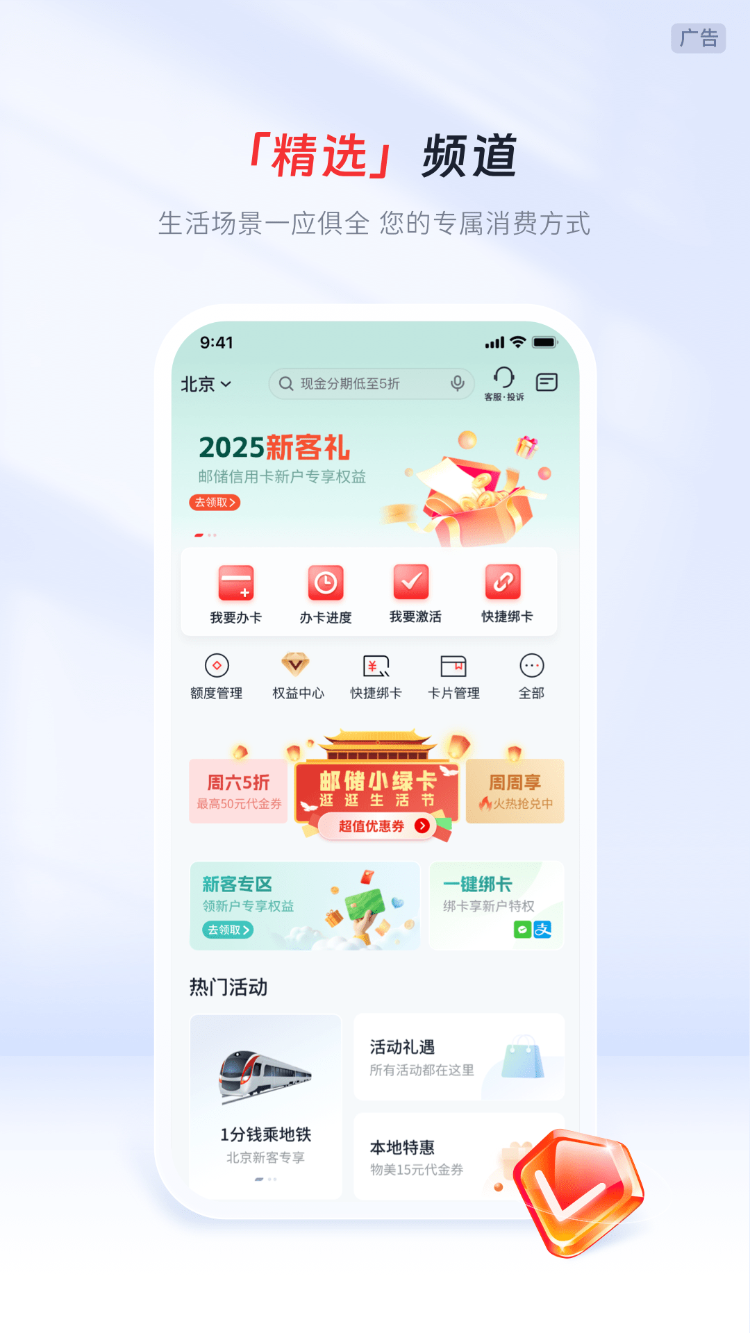 小编提醒:投资有风险,选择需谨慎!软件商店提醒您,软件商店仅作为应用程序分发及信息发布平台,不提供相关金融服务,不构成任何担保或承诺;请您使用此类应用时谨慎选择,充分了解风险,理性投资,保护自身财产安全! 详情描述:邮储银行信用卡官方 APP 邮储信用卡APP由中国邮政储蓄银行官方出品,秉承“进步与您同步”的理念,为您提供安全、便捷、多样的网上自助金融服务,是一款汇集生活、消费、金融服务为一体的综合服务平台。邮储信用卡APP分五个模块:精选、享积分、惠生活、信用卡、我的,可提供账单查询、还款、积分兑换、分期申请、额度管理等金融功能,加油洗车、爱车养护、影票购买、话费充值、美食商圈等生活场景服务,更有白金服务、原创主题、大字版、语音搜索等特色服务。 【精选】:生活场景一应俱全,“邮储小绿卡逛到就省到”、活动礼遇、选卡专区等更多精彩享不停。 【惠生活】:咖啡饮品、分期商城、生活娱乐、爱车生活、热映影片、商圈优惠,吃喝玩乐应有尽有。 【享积分】:心愿好物积分畅兑,看榜单、兑好礼。 【信用卡】:信用卡服务聚合,卡片权益一屏尽览,查账还款、额度管理,热卡推荐、分期轻松还。 【我的】:优惠券订单聚合,专属权益一手掌握,安全中心快速直达,大字版本随心换。 欢迎您的使用,在使用过程中遇到任何问题,可通过以下方式查询和反馈: 在线客服:我的-服务大厅-我的客服; 客服热线:400-88-95580。