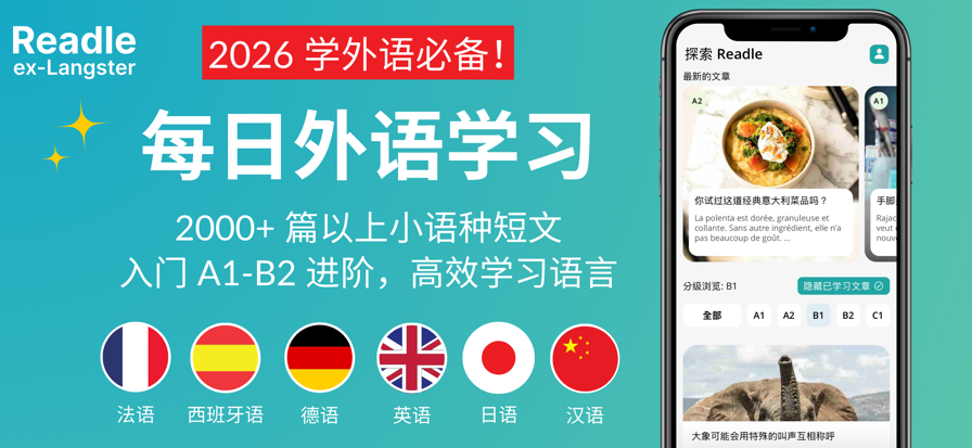 Readle (ex-Langster) 每日外语学习:结合听力、阅读、词典、语法、背单字练习,是最有效的英语、法语、德语、西班牙语、日语、汉语学习软件 ,帮助你轻松学语言,流利说小语种! 选择适合你的法语、英语、德语、西班牙语( A1 入门 - B2 进阶)、日语(N5-N2)、汉语(HSK1-HSK4)语言程度 ,挑选你感兴趣的主题开始阅读外语文章与新闻。透过由外语人士朗读的文章,持续的练习阅读、听力,并从文章中学习新的语法、单词,并透过语法解说、即时词典、单词卡的帮助,让你轻松提升外语能力。 为什么选择 Readle (ex-Langster) ? • 我们的外语语言专家将国际新闻转化为有趣的短篇语言学习课程,专门为你量身定制。 • 数以百计的短篇文章,是你阅读、听力、语法和背单词的小语种学习最佳助手。 免费下载 Readle,轻松学习语言! =============== 在软件内可以学习哪些语言? 目前可以学习 法语|西班牙语|德语|英语 |日语|汉语 =============== 每日阅读与听力练习,简单自学外语: 【 科学验证的有效学习方式 】 - 我们的学习方式,经过德国大学研究验证有效地维持学习动机、提升语言学习速度高达3倍。 【 量身打造的语言学习内容 】 - 我们的语言专家为华语人士量身定制的学习文章。每篇文章标示适合的法语、英语、西班牙语、德语程度 A1, A2, B1, B2、日语(N5-N2)、汉语(HSK1-HSK4),帮助你逐渐理解及适应语言,增强语感。不论是日常生活、职场商务、语言检定考试(全民英检, 托业, 托福, GRE, 雅思, 四六级, DELF, DALF, TCF, JLPT)或是要到海外留学的语言学习者,Readle 是你最佳的学习英语、西班牙语、德语、法语、日语、汉语助手! 【 外语朗读 】 - 文章搭配母语人士录音朗读,让你边读边听,增强英语、西班牙语、德语、法语、日语、汉语听力理解能力。 【 即时词典 】 - 即点即查的英语-中文、法语-中文、德语-中文、西班牙语-中文、日语-中文字典翻译,通过点击单词直接在每个故事或新闻中查找单词翻译。学习基本单词、短语、动词和词汇的最简单方法。只需轻点动词即可学习动词变位。无需使用其他的软件,如 Reverso、Larousse Francais、conjugaison française、leo dict 或其他法语、德语、西班牙语、英语、日语、汉语字典或翻译软件,简单有效! 【 外语语法解说 】 - 超过 200 则以上详尽的英语、法语、德语、西班牙语、日语、汉语语法解说,让你快速掌握语法重点。 【 重点单词 】 - 重点单字整理加上发音,让你轻松增加英语、法语、德语、西班牙语、日语、汉语单词量。 【 阅读测验 】 - 文章学习完毕后,透过阅读测验训练自己的语言理解能力。 【 单词记忆 】 - 内建单词卡复习工具(如Anki, Quizlet),透过「间隔记忆法」复习单词,克服遗忘曲线。轻松新增文章中所阅读到的新单词到你专属的词卡,透过单词卡持续复习,帮助你高效率背单词。 【 丰富语言学习内容 】 - 内建 2000 篇以上英语、法语、德语、西班牙语、日语、汉语学习文章,每日更新。文章主题广泛涵盖包含: ・法国、美国、英国、德国、西班牙、日本、中国文化 ・新闻时事 (TV5monde, BBC, RFI, France 24, Le Monde, French TV, radio, DW Deutsche Welle…等) ・科技 ・旅行 ・美食 ・娱乐 ・运动 ・科学与医疗 ・其他 Readle 是外国留学旅游、生活必备,同时也是你检定考试或自学英语、法语、德语、西班牙语、日语、汉语最好的助手! 立即下载并试用 Readle - let's learn English, French, German, Spanish, Japanese and Chinese together! 重要提醒: 英语、法语、德语、西班牙语、日语、汉语我们提供一部分初级的文章免费阅读学习,免费文章会不定期更新。 为了学习更多英语、法语、德语、西班牙语、日语、汉语的进阶内容,需要按月或按年进行订阅。 —————— 你的鼓励和建议是我们团队不断进步的动力,我们期待你的评分及评论! ・联系客服:support@readle-app.com ・隐私政策:https://readle-app.com/en/privacy-policy/ ・使用条款:https://readle-app.com/en/terms-of-use/