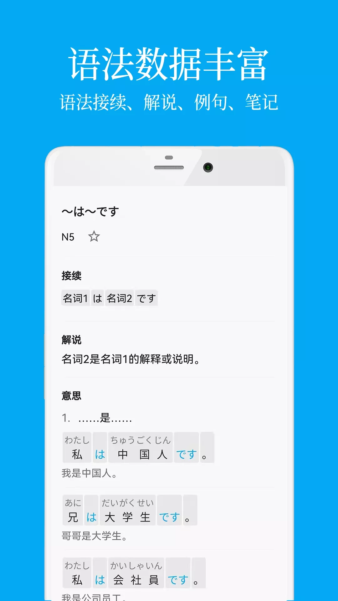 全能型日语学习助手,让日语学习变得简单。全新的计划背单词,科学安排背单词,更有多达13种单词复习模式,只为让单词记得更牢固。更有五十音图、汉字转假名、日语歌词、日语分词、中日互译、假名互转、常用汉字、日语手写板等辅助工具,只为让日语学习变得简单。 【全新计划背单词】 可以设定计划背单词,每个单词都包含假名、发音、音调、例句 【多达13种复习模式】 听音辨意、听音写词、假名选意、听音打词、假名组合等 【完备日语词库】 涵盖新标准日本语、新编日语、大家的日语以及日本语能力测试JLPT词库 【日语歌词】 提供超过10万日语歌词的罗马音和假名,日语小白也可以轻松学会唱日语歌曲。日语歌词标注神器轻松把日语歌词中的汉字标注罗马音和假名 【日语辅助工具】 ★五十音图,真人发音、笔顺动画,轻松记忆日语五十音 ★汉字转假名,日语文章假名标注神器,轻松阅读日语文章 ★日语分词,日语文章分词和词汇分析神器 ★中日互译,提供翻译发音及假名标注 ★常用汉字,提供2106个日语常用汉字查询,权威、准确 ★应急日语,提供实用69句日语会话,并有罗马音标注 ★日语手写,不会的汉字可以手写,并有假名标注