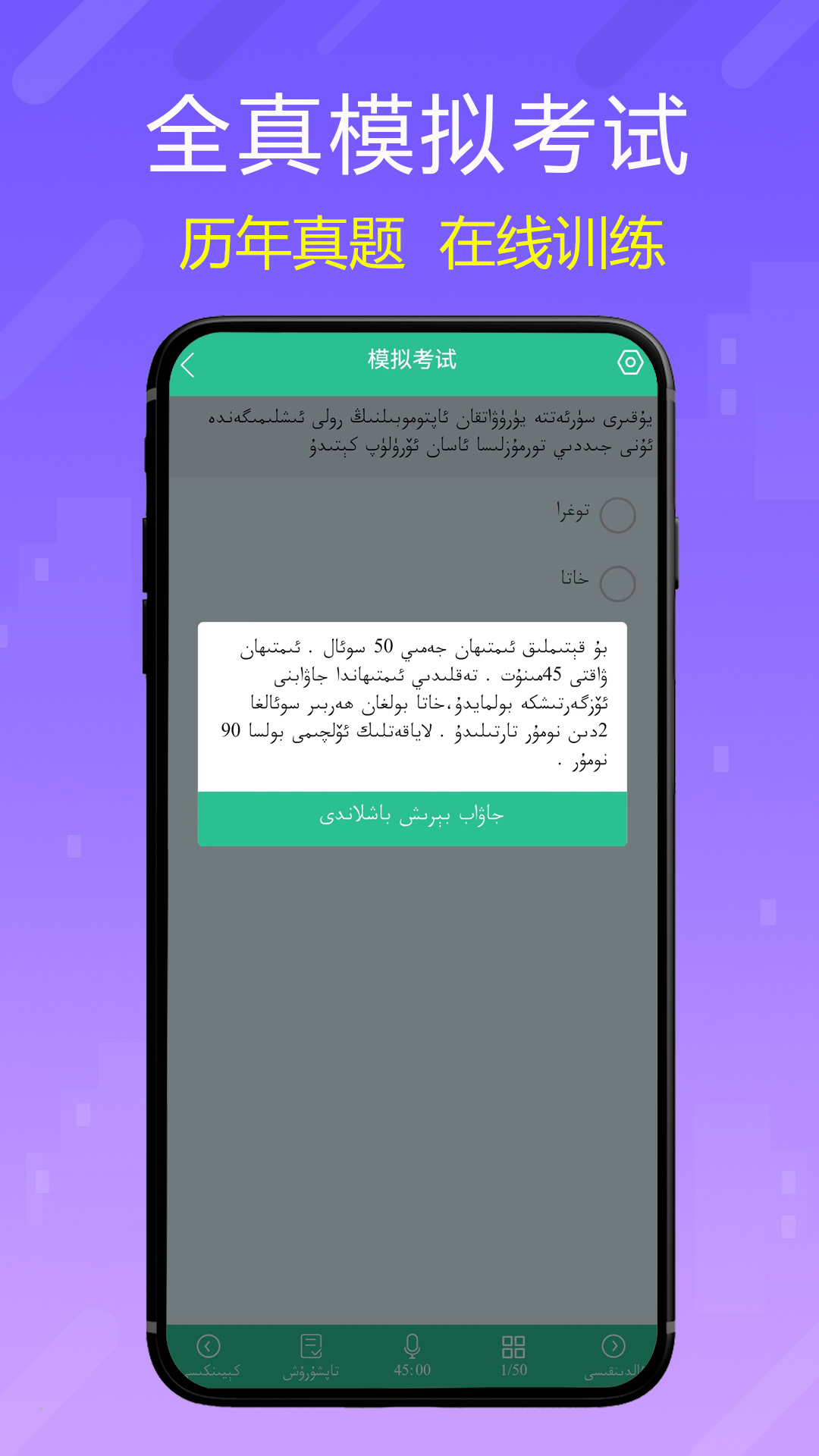 驾考宝典隆重推出维语版软件啦!本软件为维语用户量身定制的小车题库,书写延续维语用法自右向左书写,同步至全国2026年新版考试题库! 【开发背景】 少数民族语言文字造就中华文化的多样性,是中国文字史的重要组成部分,为民族文化的发展提供了重要支持。世界上大概每天有许多语言文字消失,保护民族语言文字的多样性具有重大历史意义,驾考宝典将响应号召,励志解决全国人民不同地区的学车需求。 【产品特色】 1、试题练习:顺序、随机、专项等多种练习模式,助你更快掌握理论题库 2、模拟考试:全真模拟考试,科目一、科目四考试满分通过宝典 3、错题收藏:自动收录错题、一键收藏难题,宝典帮你全方面复习 4、图标速记:巧妙记忆交通标志、交通法规,全力冲刺驾校考试 5、知识扩展:驾考易错题、重难点一键巩固,让每个学员考试无忧