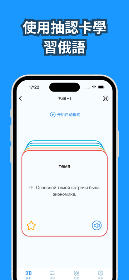 学习俄语应用是一款专为学习俄语词汇设计的工具。通过简单易用的词汇卡,用户可以轻松学习新的俄语单词。每张词汇卡都提供俄语单词的发音,帮助用户掌握正确的读音。同时,卡片中包含两个例句,展示单词在实际句子中的使用方式,方便理解和记忆。 应用特点: 使用词汇卡帮助记忆俄语单词,提高词汇量。 可将喜欢的单词加入收藏,方便反复复习。 测试模块用于检测词义理解,帮助用户了解学习进度。 配对游戏模块通过匹配俄语和中文单词,增强记忆效果。 应用包含29个难度级别,适合不同阶段的学习者逐步提升。 这款应用适合任何想系统学习俄语词汇的人。利用词汇卡、测试和配对游戏,您可以轻松掌握俄语词汇,提升语言能力。通过合理安排学习进度,帮助您一步步进步。 Terms of Use: https://www.apple.com/legal/internet-services/itunes/dev/stdeula/ Privacy Policy: https://www.appfluxlabs.com/privacy-policy