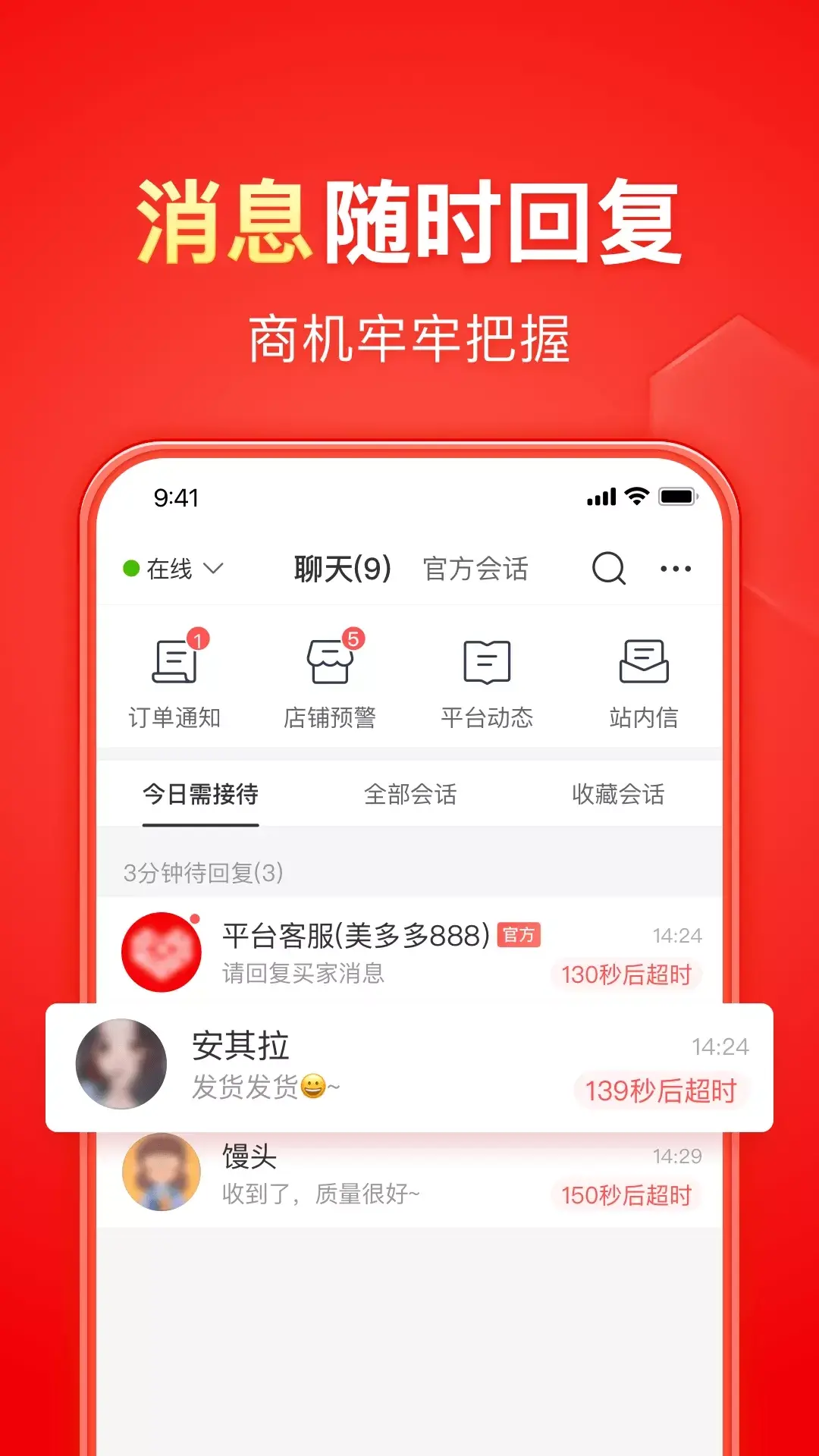 【拼多多商家版:0保证金开店,坐享亿万用户】 拼多多官方推出的手机版店铺管理平台,1分钟掌握店铺动态,1站式搞定日常经营! ---功能简介--- 【真正0元开店】0保证金经营,手机1秒极速开店 【多店铺经营】可同时管理多个店铺,1键切换 【多渠道营销推广】免费活动流量及精准推广渠道,助您快速爆单 【高效客服工具】随时随地回复顾客咨询,不错过1个客户 【订单统一处理】待处理订单及时跟进,不错过1个订单 【数据尽收眼底】核心业务数据一览无余,生意走势一手掌握 【商品精准运营】基于大数据精准选品,高效运营有的放矢 【丰富营销工具】丰富的营销玩法快速提升店铺转化 【资金极速提现】快速充值极速提现,资金流水一目了然 【百万商家社区】与百万商家交流经营干货,长知识有温度 【贴心官方服务】新手快速入门,专业客服为您贴心服务 -倾听你的声音- 使用过程中遇到任何问题,请联系我们 【微信公众号】搜索关注微信公众号—拼多多商家服务:pddsjfw 【在线客服】进入拼多多商家版>我的>在线客服 【意见反馈】进入拼多多商家版>我的>设置>帮助与反馈>反馈 感谢商家朋友们不断提出的宝贵意见,我们一直在努力倾听并持续改进!