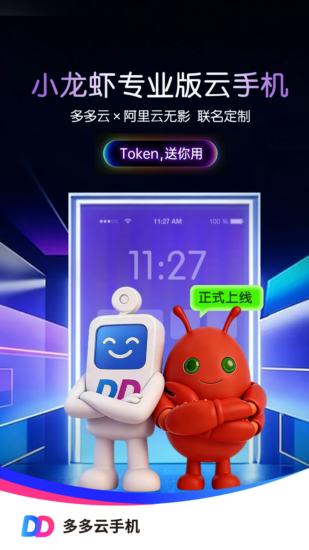 多多云手机,“小龙虾专业版云手机”正式上线 你的另一台虚拟手机,一款能够轻松在云端智能运行游戏&应用,帮你解放双手的好帮手,带你开启云端新生活! 1.【云端智能运行】:云端在线,省电省流量,效率翻倍,省钱更省力! 2.【支持优质手游】:已适配市场上99%手游,让手机变身持续在线游戏手机,0流量0耗电,不怕断网、不怕关机、不占本地存储空间,让手机运行更顺畅。关机断网也能玩手游。 3.【云AI弹性扩容】云手机拥有AI云计算特点,具备天生优势,降低设备成本和人力成本,提高生产效率。且云端支持弹性扩容,可根据您的需求灵活升级配置。 4.【高端配置】:云手机免调试分辨率完美适配主流游戏/应用。软件界面美观,便捷好用,软件体积小巧,不占用系统资源,使用方便。