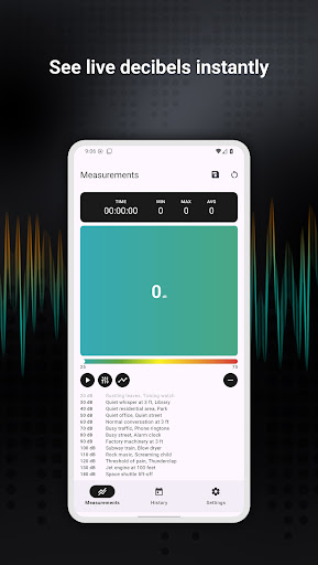 ❓ 您是否正在寻找一款可以测量您周围声音的应用程序?那么这款声级计就是最好的选择。您可以快速确定声音响度,因为它既可以检测也可以测量声音。<br><br>立即下载声音计分贝,您可以使用智能手机快速测量噪音<br><br>️🎶 噪音会对您的身心健康产生负面影响。您应该避免出现在这些环境周围。使用我们的分贝计来评估您的环境水平。使用此声级计,您可以快速识别极其响亮的声音,以保护您的听力免受震耳欲聋的噪音的影响。<br><br>️🎶 这个声级计是如何工作的?<br>通过智能手机的麦克风,这款声音计应用程序可以测量声音和环境噪音。音量值在分贝计应用程序中显示为图表和数字。读取声级并确认声音有多大<br><br>声级计<br><br>120dB——疼痛阈值、雷声<br>110dB - 音乐会、尖叫的孩子<br>100dB - 摩托车、吹风机<br>90dB - 柴油卡车、动力割草机<br>80dB - 大声的音乐、闹钟<br>70dB - 交通繁忙,吸尘器<br>60dB - 3 英尺处正常对话<br>50dB - 安静的办公室,中等降雨<br>40dB - 安静的图书馆,鸟叫声<br>30dB - 耳语,安静的乡村地区<br>20dB - 树叶沙沙作响,手表滴答作响<br>10dB - 几乎安静,呼吸<br><br>🔊 设置通知<br>该声音计允许您在声音达到阈值时设置通知。此功能使您能够有效保护您的听力。<br><br>🔊 音调发生器<br>使用该分贝计可以产生频率在 16Hz 到 16000Hz 之间的正弦波、方波、锯齿波或三角波。它操作简单明了,可以产生精确的音调和声波。您可以快速创建音调来调音乐器、测试音频系统和测试听力。<br><br>声级分贝计特点:<br>✅测量环境声音<br>✅ 实时声音图表<br>✅ 显示录音期间的最低、最高和平均分贝 (dB)<br>✅ 存储录音<br>✅ 人体或音频系统的声音测试<br>✅ 设置声音阈值通知<br><br>🔴注释<br>大多数设备都具有面向人类语音的麦克风,并且硬件限制了最高值。因此,该仪器不是可靠的分贝计。<br><br>☎️如果您对声级计应用程序有任何疑问,请通过 3xi4991@gmail.com 与我们联系。我们总是很高兴收到您对增强此应用程序的所有评论。<br><br>感谢您使用声级计分贝!