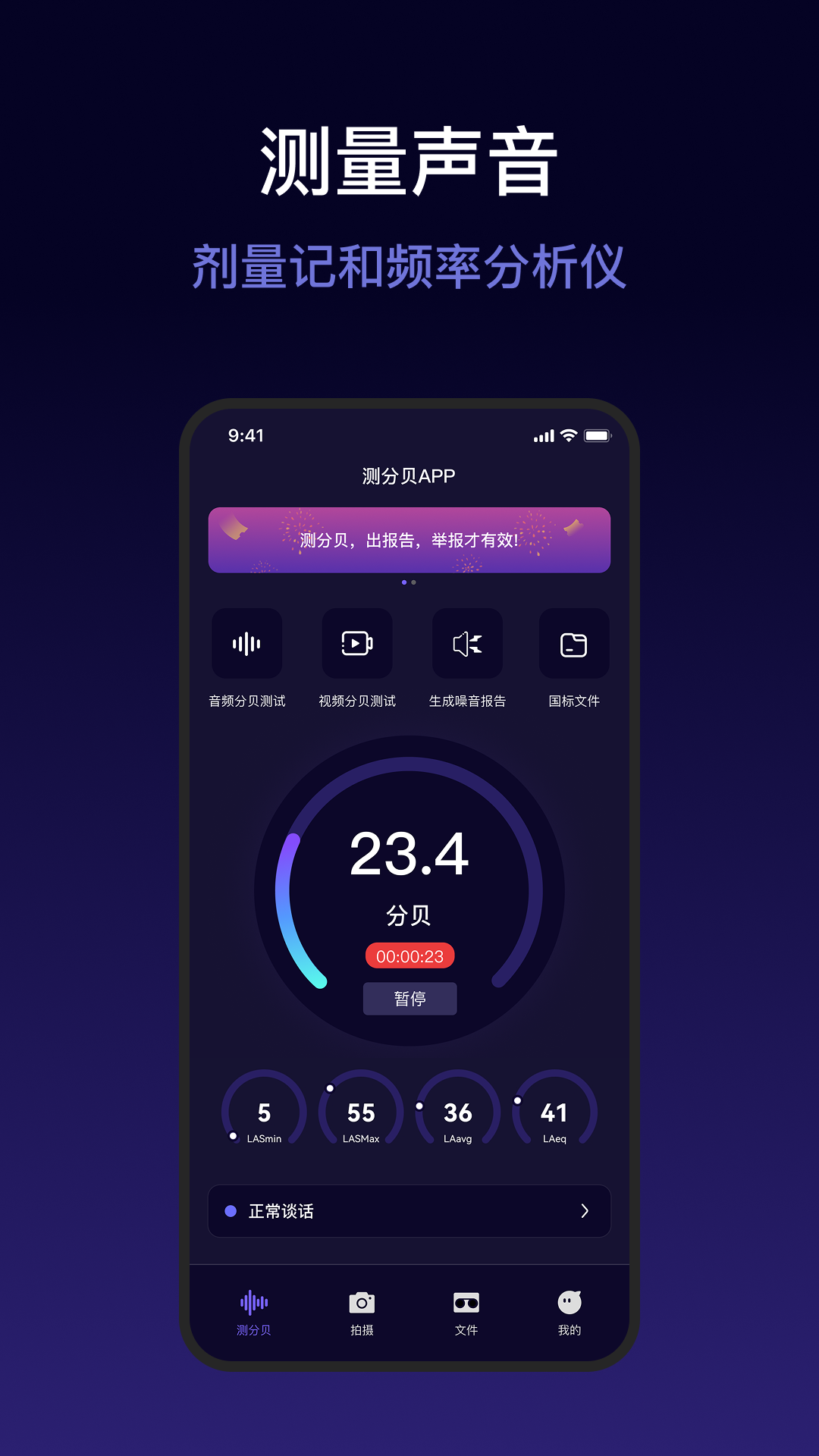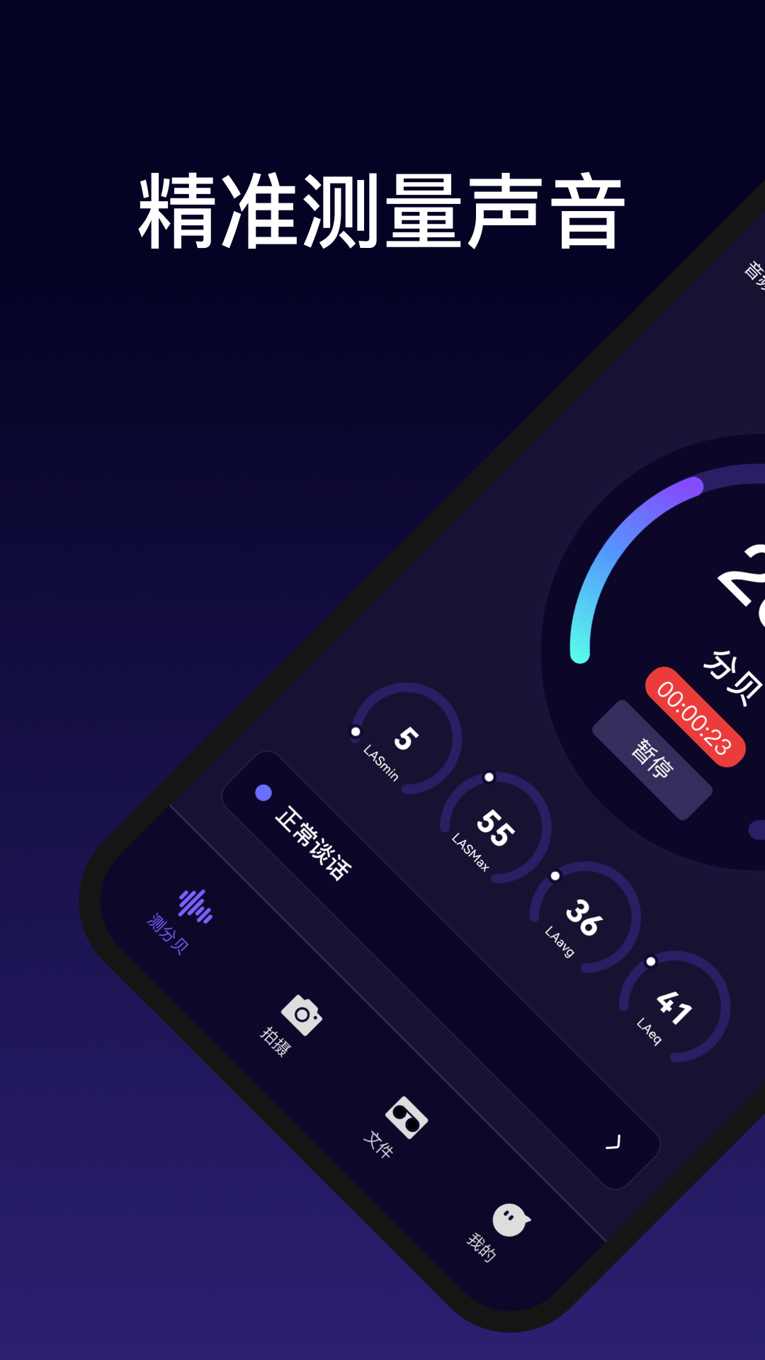 分贝噪音测试-噪音测量检测仪,环境噪声音量分贝测试。高精度专业级噪音检测,快速响应分贝数值变化,A&C计权升级测试算法,噪音测试数值更加精准。噪音分贝水印相机拍照&录像,记录环境噪音分贝情况。支持噪音测量高清录音回放功能,最大分贝值&最小分贝值记录,分贝测试结果实时图表显示。无论是图书馆、办公室、学校、卧室、工厂等环境噪音检测,还是家电、汽车、机械、装修的名等设备噪音检测,分贝噪音测试都能轻松搞定,满足您一切关于工作、生活、学习等噪音检测需求。<br><br>【专业级噪音计】A&C加权噪音检测算法,高精度噪音分贝测试,理论测量误差 ±1.5db;<br>【高敏快速响应】实时噪声分贝检测仪,快速响应噪音分贝变化,声源高频率取样2次/秒;<br>【实时噪音测量】噪音分贝最大值 / 最小值显示,噪音分贝数值稳定,支持分贝数值保持;<br>【噪音分贝水印】环境噪音情况拍照&视频记录分享,噪音分贝数值,噪音测量地点水印;<br>【分贝检测记录】超长分贝测试记录保存,详细的噪音分贝信息。检测噪音高清录音回放;<br>【多领域噪音计】学习生活环境噪音,家电机械噪音,活动工地装修现场噪音等领域检测。