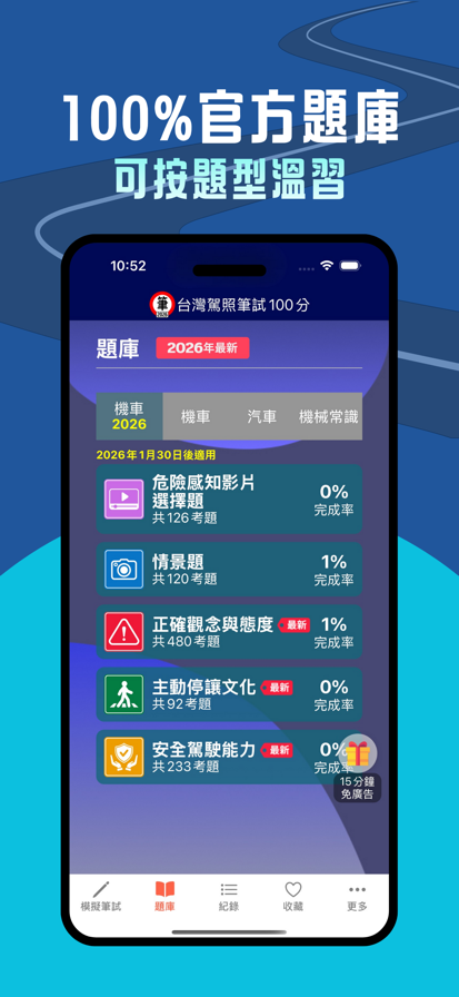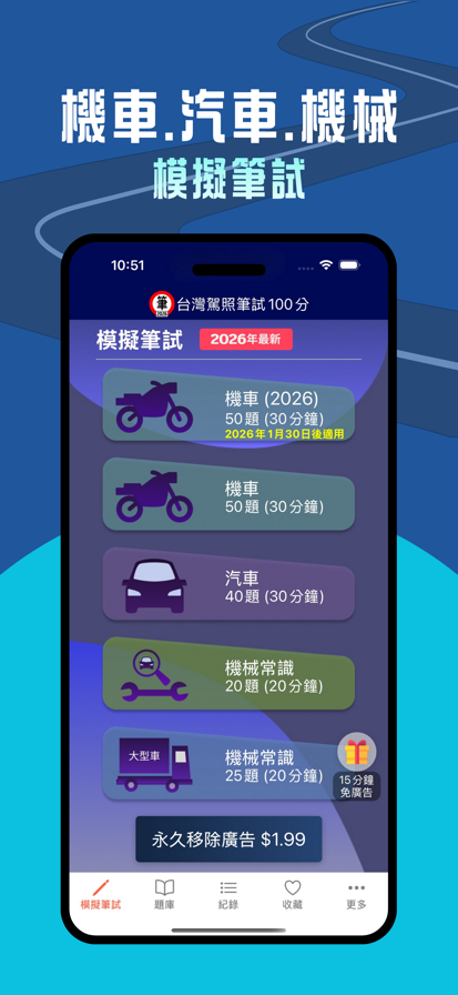 **【重要】機車筆試新制上路 ** 公路局宣布,自 2026 年 1 月 30 日起(民國 115 年),機車駕照筆試將實施新制,取消是非題,全面改為選擇題,並提高情境題與危險感知題比例。 《台灣駕照筆試100分》已同步收錄 新制與舊制題庫,考生可依考試日期選擇適用模式,安心準備不怕讀錯。 **最新納入危險感知影片筆試題庫計126題** **公路局宣布,機車駕照筆試從113年6月5日起,增加5題的危險感知影片考題,將從題庫中隨機抽選** 專為考駕照而製作的App! 不論是考機車駕照還是考汽車駕照都通用。用心製作的App 希望能為考駕照的您出一分力。 《台灣駕照筆試100分》應用程式是參照《中華民國交通部公路總局》的筆試題庫所製作的,包含機車駕照題庫,汽車駕照題庫,職業小型車機械常識筆試題庫以及2022年7月1日啟用的職業大型車機械常識筆試題庫,方便考生為考駕照做準備時能隨時隨地練習,順利通過機車駕照和汽車駕照的考照筆試。 無論您考的是機車駕照筆試還是汽車駕照筆試,我們都希望《台灣駕照筆試100分》能夠幫得上忙。 筆試題庫資源: https://www.thb.gov.tw/ 中華民國交通部公路總局 >> 監理服務 >> 筆試題庫 出版: 民國115年 (2026年) 2026年考照筆試題庫 (新版) 完整支援 2026 年 1 月 30 日起實施之機車筆試新制 兼容新舊版本題庫 機車駕照(超過 1700 題) 新制筆試(2026 年 1 月 30 日後適用) 危險感知影片選擇題 情境式題目 正確觀念與態度 主動停讓文化 安全駕駛能力 舊制筆試(2026 年 1 月 30 日前適用) 法規是非題 法規選擇題 標誌是非題 標誌選擇題 情境題 危險感知影片選擇題(113 年 6 月 5 日起新增) 汽車駕照 (超過1400題) 法規是非題 法規選擇題 標誌是非題 標誌選擇題 機械常識 (超過400題) 是非題 選擇題 是非題 (大型車) 選擇題 (大型車) 完整題庫範例 《台灣駕照筆試100分》應用程式是根據《中華民國交通部公路總局》筆試題庫資源提供100%題庫範例,用戶不會錯過任何試題,讓您有充足的準備應付考照筆試。 模擬筆試 模擬筆試的題目是按比例分配 (是非題、選擇題、標誌題、法規題),隨機出題,讓您熟習筆試的模式及掌握在限時內完成。完成筆試後立即顯示成績,用戶可重點檢查錯誤的考題,幫助暸解弱點並加強複習。 筆試紀錄 用戶在完成筆試後,程式都會按日期時間記錄下來,用戶可隨時查看成績及翻查題目,幫助學習。 附有模擬考小統計及信心指數,令用戶更清楚自己的表現。 收藏題庫 在進行模擬筆試時,用戶可以收藏題目,待完成筆試後方便重點重溫。 細緻的溫習模式 一眼看到溫習進度,並可從題庫自訂溫習範圍順序或隨機作答。選擇溫習範圍時,系統更會顯示上一次答對與否,可以針對性地溫習。題目附有詳解 ,以便用戶更了解題目。