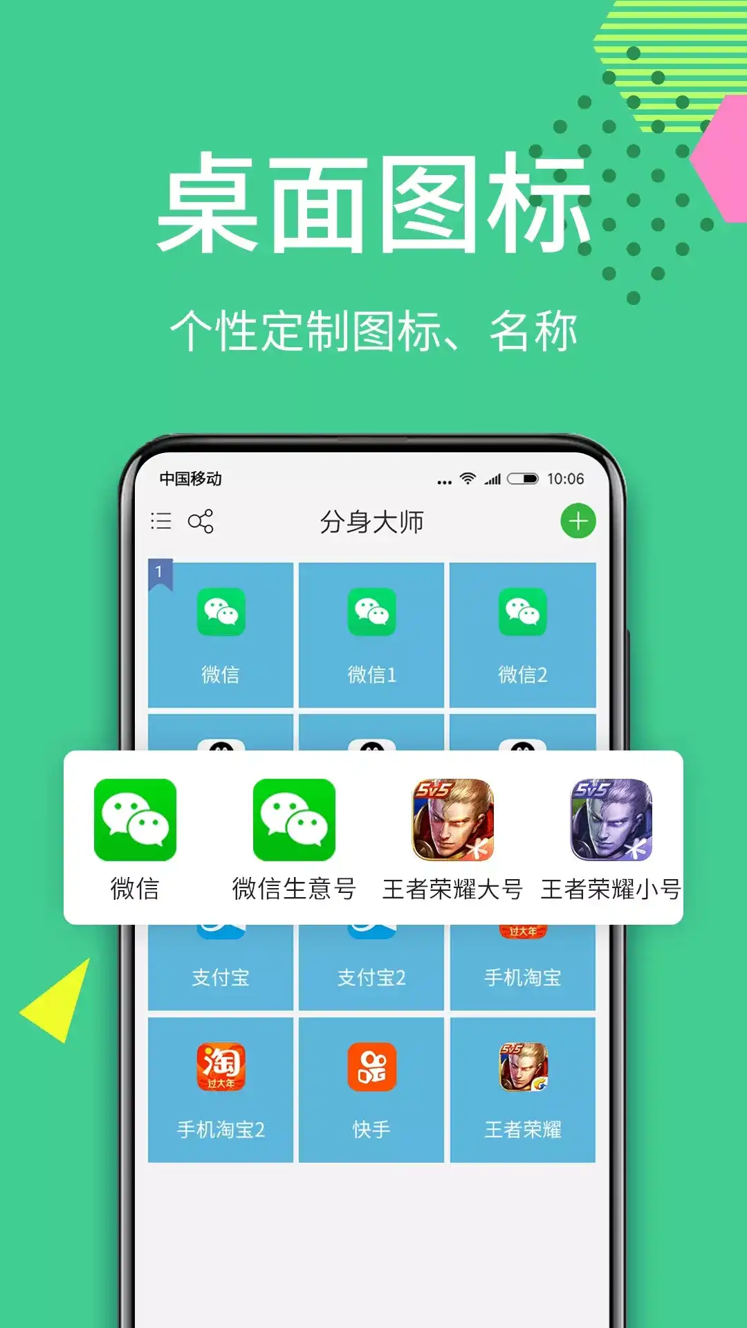 微分身 支持32/64位微信的微信分身、微信双开、微信多开,兼容安卓15!轻松实现应用游戏双开、多开、分身,重点适配每个微信分身版,一部手机轻松实现微信2应用分身账号同时在线! 【应用游戏多开分身 游戏挂机神器】 ●免费双开:支持微信、QQ、淘宝、支付宝、抖音、王者等应用游戏微双开/微分身,小号分身源自官方,独立运行,分身体验与原版应用一模一样; ●无限分身:独立研发的应用多开功能,实现京东、赞丽生活、派派、快手等应用多个小号同时在线,不限多开个数,解决多个账号频繁切换登录的烦扰; 【我们一直在努力】 ●独立桌面图标:长按软件内分身APP图标,可进行添加桌面快捷方式,双开的应用在桌面就可使用,方便快捷; ●消息提醒设置:多个微信,同时在线,无延迟同时收发消息; ●分身伪装:长按软件内分身APP图标,可进行修改分身账号图标和名称,方便管理,无需担心开错号;