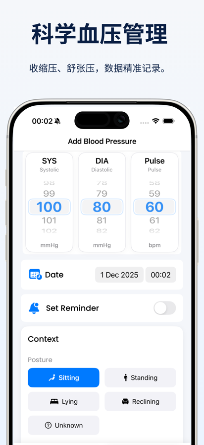 使用「血压跟踪器」掌控你的健康:您的全面健康伴侣! 「血压跟踪器」 让你能够轻松监控和管理你的健康,帮助你保持强壮,过上更健康、更长寿的生活。这款应用设计简洁、精确,提供一系列功能来跟踪你的重要健康指标并让你随时了解自己的健康状况。 轻松的心率监测 – 只需使用 iPhone 即可快速准确地测量你的心率。 – 只需将手指放在相机上即可获得即时结果,或同步 Apple Watch 上的数据以实现无缝跟踪。 血压和心率跟踪 – 监测你的血压水平和心率随时间的变化趋势。 – 记录和查看你的数据,随时了解你的心血管健康状况。 体重管理跟踪器 – 跟踪你的体重变化并添加个性化注释以监控进度。 – 使用易于阅读的图表和图形可视化你的旅程。 综合健康日历 – 以详细的日历格式查看你的健康指标。 – 通过每日、每周、每月和每年概览分析趋势。 自我管理健康测试 – 直接在应用程序内执行三项关键的自我管理健康测试: – 鲁菲尔深蹲测试:评估你的心血管健康和恢复情况。 – 肺功能测试:测量你的肺活量和呼吸健康。 – 定时吸气能力测试:评估你的呼吸效率和吸气肌强度。 无缝健康应用程序集成 – 将你的所有健康数据与 Apple Health 应用程序同步,以统一查看你的健康状况。 以 PDF 格式导出数据 – 以 PDF 格式导出你的健康报告,以便与医疗保健专业人员或个人记录保存轻松共享。 支持 Apple Watch – 直接从 Apple Watch 添加症状并记录脉搏测量值。 – 随时随地更新你的健康统计数据。 人工智能健康助手 – 根据你的健康数据获取个性化建议和见解。 – 积极主动地获取量身定制的提示,以改善你的健康状况。 免责声明: 「血压跟踪器」 旨在帮助你监测你的健康和健身状况,但它不是诊断工具。请务必咨询医疗保健专业人士以获得医疗建议或诊断。 *你的数据将自动从 Apple Watch 接收(它在后台模式下进行心率测量)并添加到统计数据中。 要获取当前值,请继续使用 Apple Watch 上的“心率”应用进行新的测量。 隐私政策:http://health-preference.com/privacy 使用条款:https://health-preference.com/tos