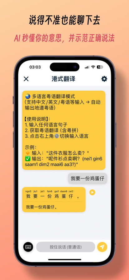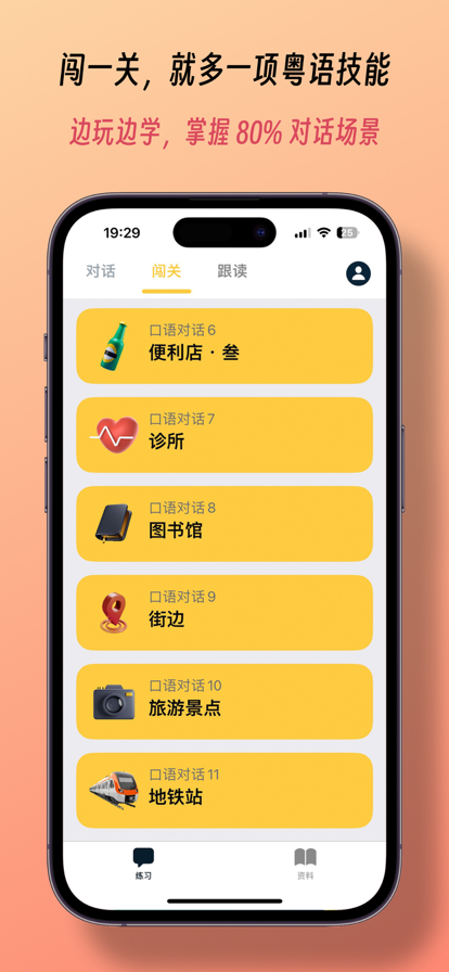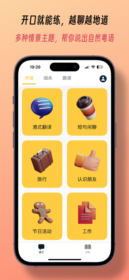 - 练习地道的粤语对话, 适合旅行或者交友。 - 真实有趣的对话情景。 - 学习适用于在国外交友和约会的日常用语。 - 总共超过800条粤语例句。全部都由真人清晰朗读。 - 每个情景对话内容会随机变化,总共有超过一千种组合可能性。 - 运用独特的学习算法,学习进度在准确的掌控中。 - 云端同步。保证你在不同的设备中保存相同的学习进度。