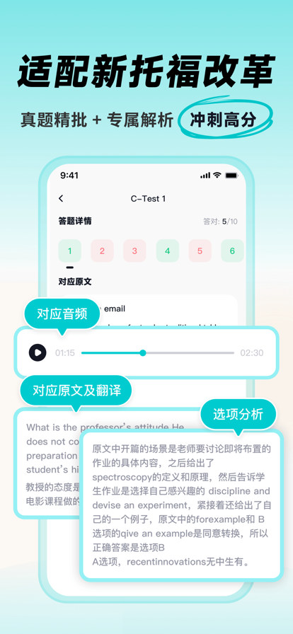 「多次元托福」一站式托福备考工具。 包含以下核心功能: 1.阅读+听力+口语+写作在线练习 2.AI精听跟读 3.考位查询 4.在线评测 5.全套托福备考学习资料 多次元教研团队专为广大托福学员打造,帮你掌握备考方法,少走弯路! 我们的slogan:让留学考试变简单,科技改变效率 【听力/口语/阅读/写作练习】 随时随地用手机在线练习托福 配套专业解析及范例回答 专属配套的成绩单,剖析你的问题 云同步你的练习记录,支持离线练习 【Ai精听跟读】 涵盖多套听力素材,科学美国人等超适合锻炼听力和口语的素材 实时测评打分,诊断你的口语水平,千万次评分引擎数据支撑准确性 原文精听精练,支持倍速调节、单句循环,逐句循环。 科学方法帮助考生提升托福听力能力 【多种学习模式】 按顺序做题,覆盖日常练习、考前练习; 按话题做题,攻克薄弱项,有效查缺补漏; 【考试日期查询】 一键查询近一年考试日期,合理安排考试规划 【在线测评】 30分钟测试,给出专业评测分析及备考建议,快速测试自己的水平,针对性的提升 【学习资料】 全套托福备考学习资料,针对各种弱项 针对托福口语阅读写作等全方位考试技巧,应有尽有 【托福入门课】 从小白入门到托福备考的经验全部采取视频录制 -托福怎么备考 -托福家考的流程 -托福报名流程 -雅思和托福的区别 -各种题型的技巧视频 如有任何问题或建议,请到“我的”-“意见反馈”中告诉我们~