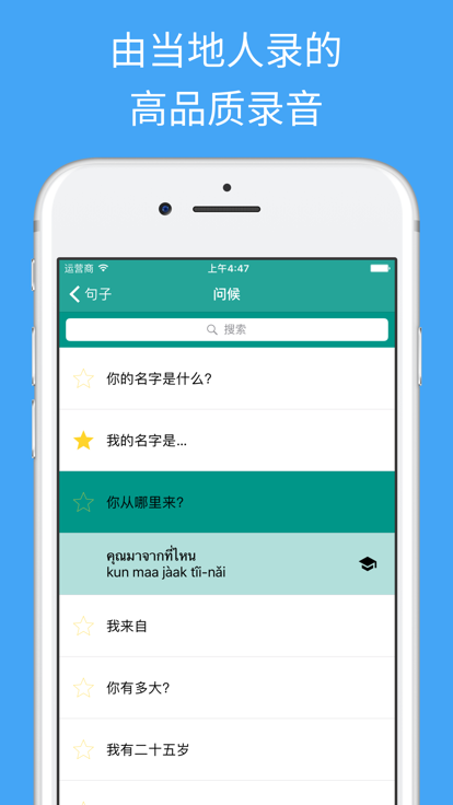 学泰语集收录了超过800句常用的短语和词汇。你将会发现这是一个非常有用的工具,尤其是当你到泰国旅游、遇见从泰国来的朋友或在泰国遇上紧急情况的时候等…… 透过本短语集,你可以跟懂得泰国语的小鹦鹉学习泰国语。无论你在何时何地,小鹦鹉都会与你一同练习您的阅读和聆听能力,你将会发现学习泰国语原来是如此简单容易。 亮点 • 收录常用的泰国语短语和词汇 • 提供正宗的发音 • 支持录制与比较自己的发音 • 储存和管理自己收藏的短语 • 实时以关键词搜索任何内容 • 支持离线使用 关于Bravolol • 网站 http://www.bravolol.com • FACEBOOK: http://www.facebook.com/Bravolol • TWITTER: https://twitter.com/BravololApps • 电邮查询: cs@bravolol.com